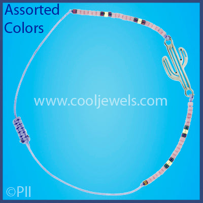 These Assorted Cactus & Colored Beads Cord Slider Bracelet features a silver cactus with colored beads on a colored cord slider bracelet.