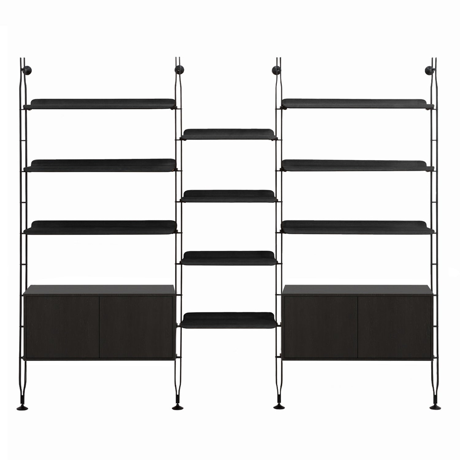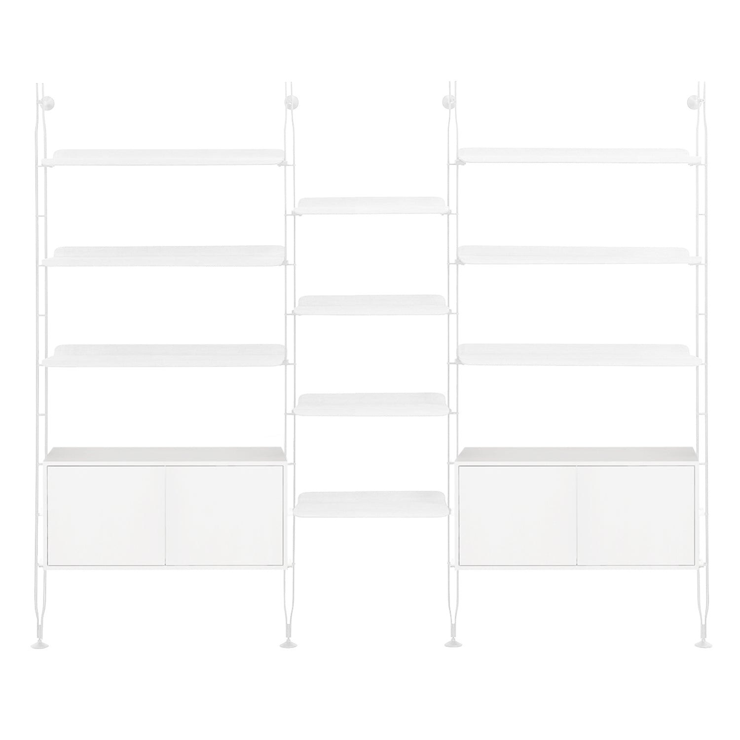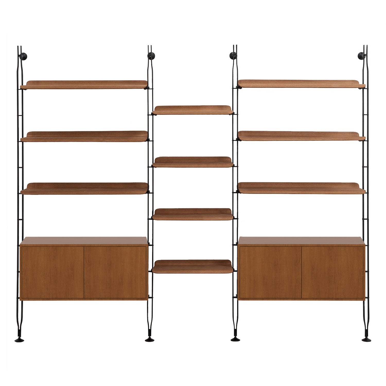 Designed by Philippe Starck for , the Adam Wood shelving unit is characterised by a mid-century modern aesthetic of clean lines and natural materials. A series of wooden shelves with finely curved edges are paired with integrated cupboard storage for neatly storing away all the essentials. Appearing to float weightlessly within a streamlined steel frame structure which mounts to the wall via integrated fittings. Additional modules can be combined to create a larger storage and display unit, whilst the shelves can be fitted at various different heights within the wall-mounted frame. Available in three finishes, this modern shelving and storage unit is perfect for use as a bookshelf, combining display space with a media unit for a tv, record player and speakers.