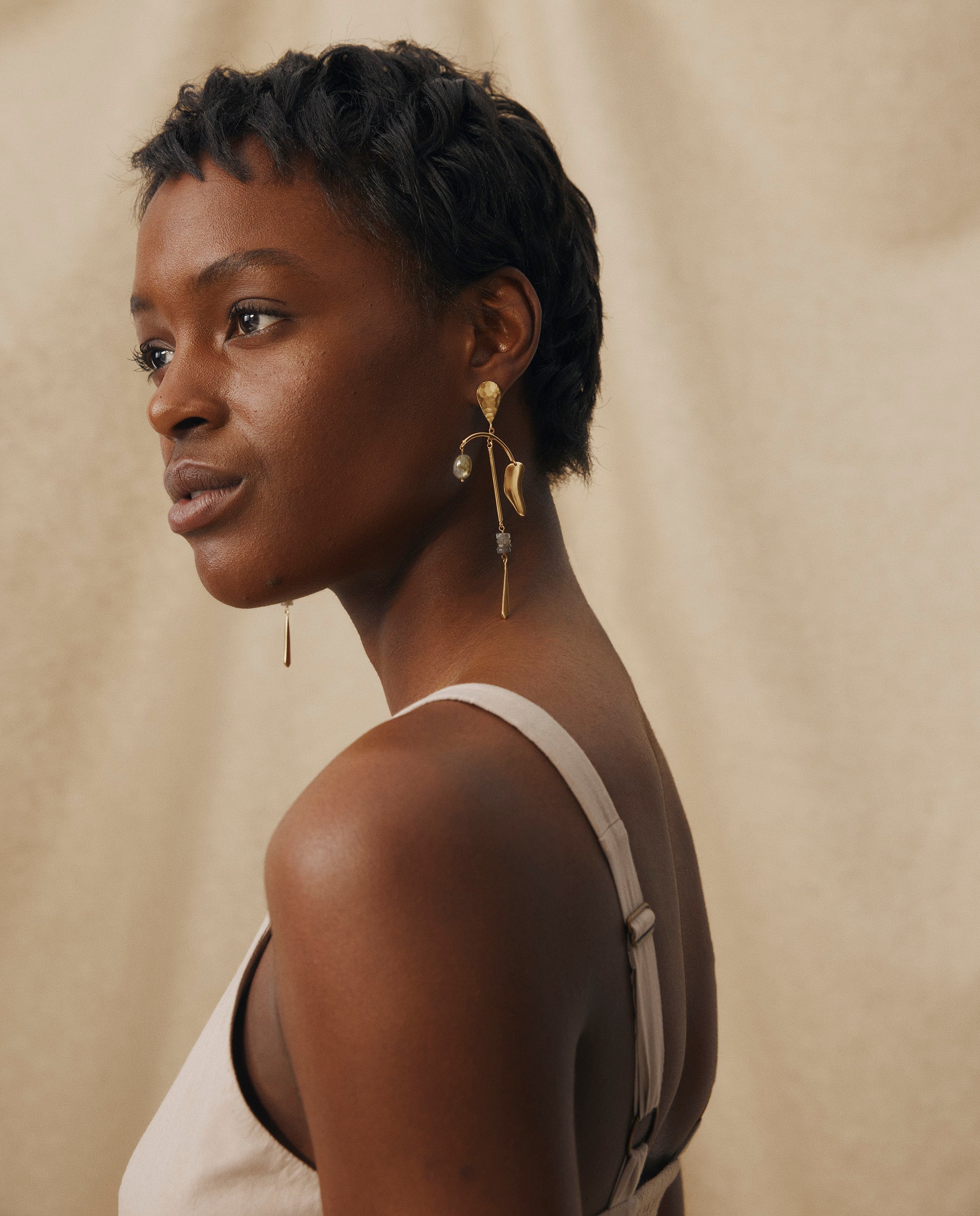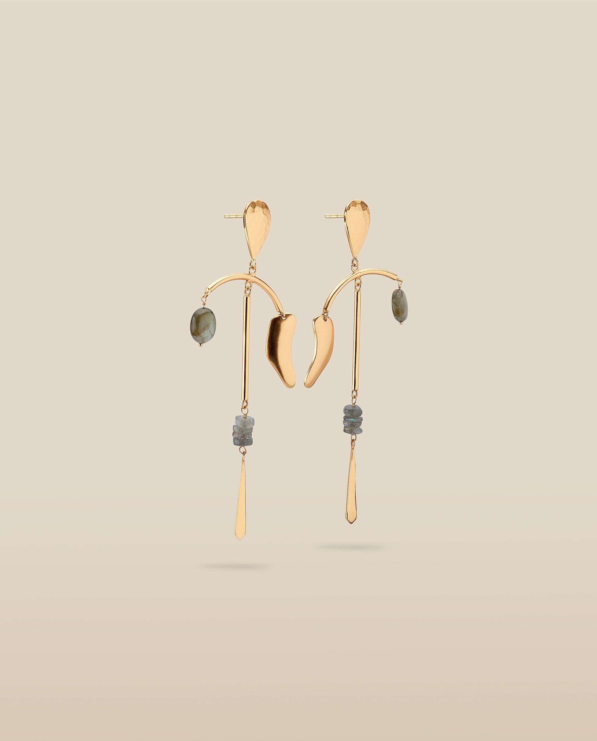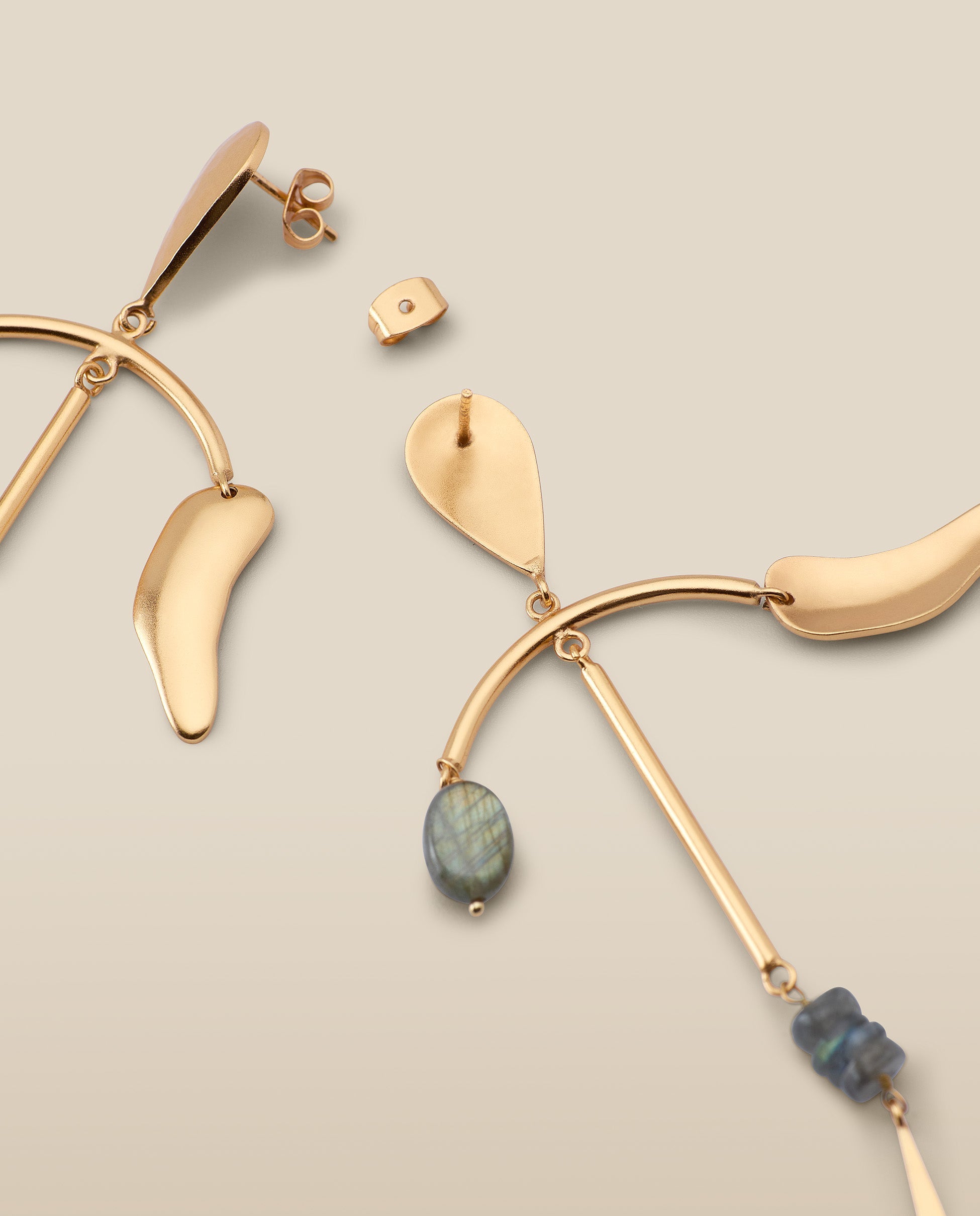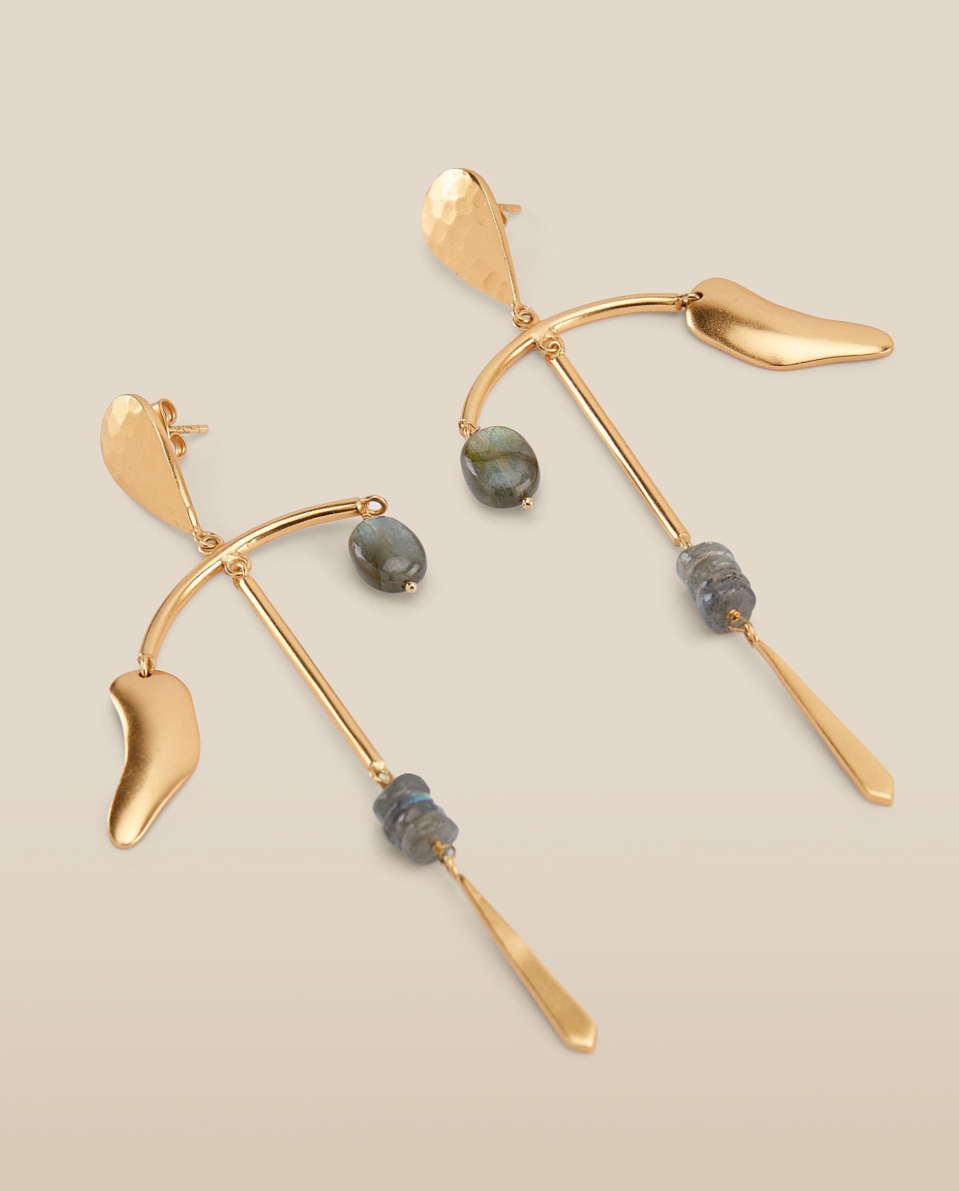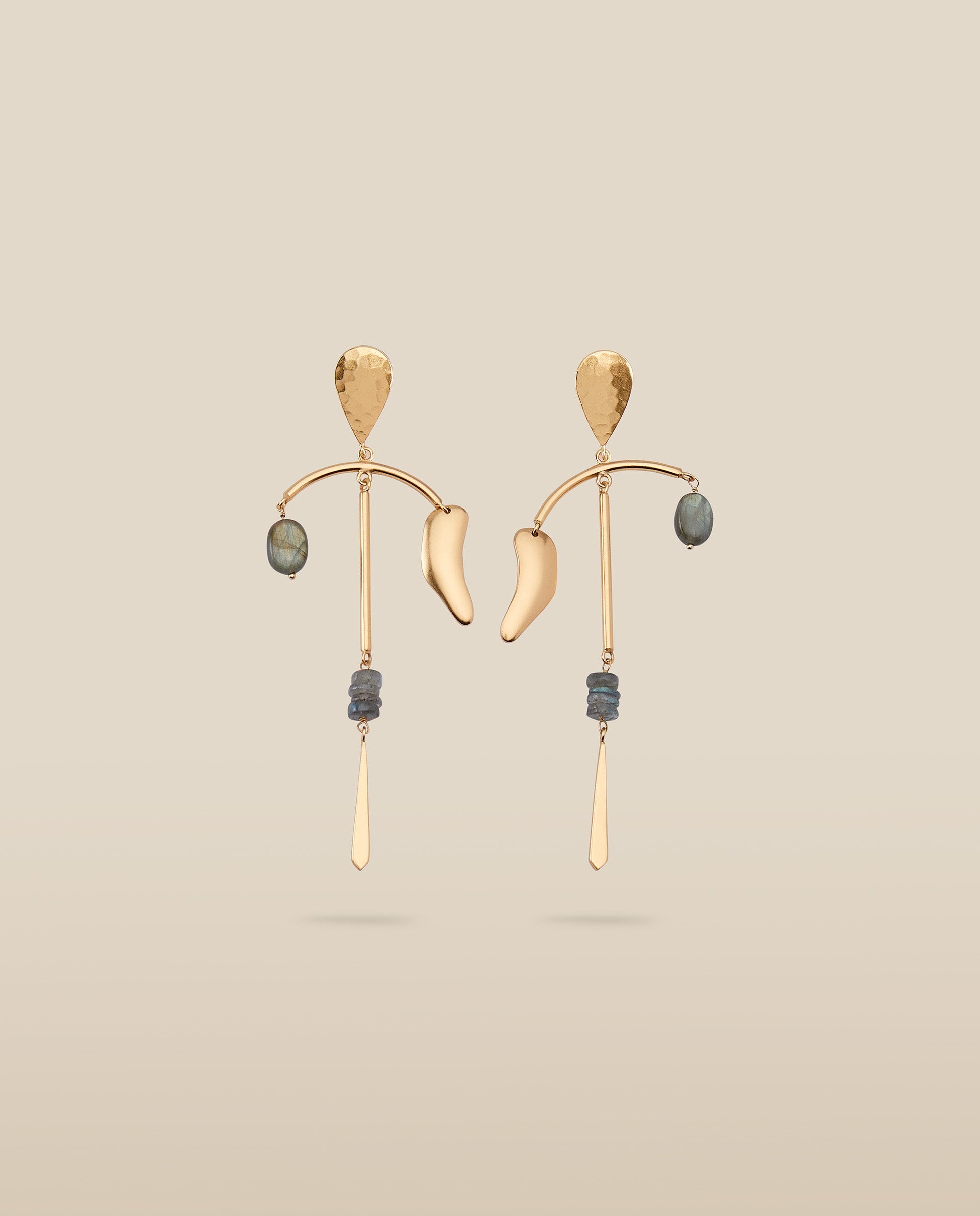 Inspirados en formas orgánicas, los pendientes Balakata combinan siluetas esculturales y naturales. Confeccionados en metal bañado en oro de 22 quilates, presentan formas metálicas irregulares con detalles martillados y acentos de piedra labradorita para un toque de naturaleza.