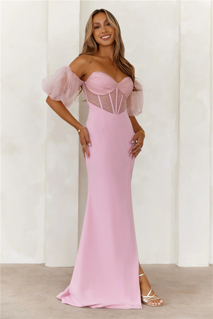 For the stylish, flirty queen the Champagne Soir��e Off Shoulder Maxi Dress is for you. A gorgeous gown featuring a tulle top, off-the-shoulder puff sleeves and a side split to the skirt. These details will make you stand out from the crowd. Simply add heels, bouncy curls and gold accessories.