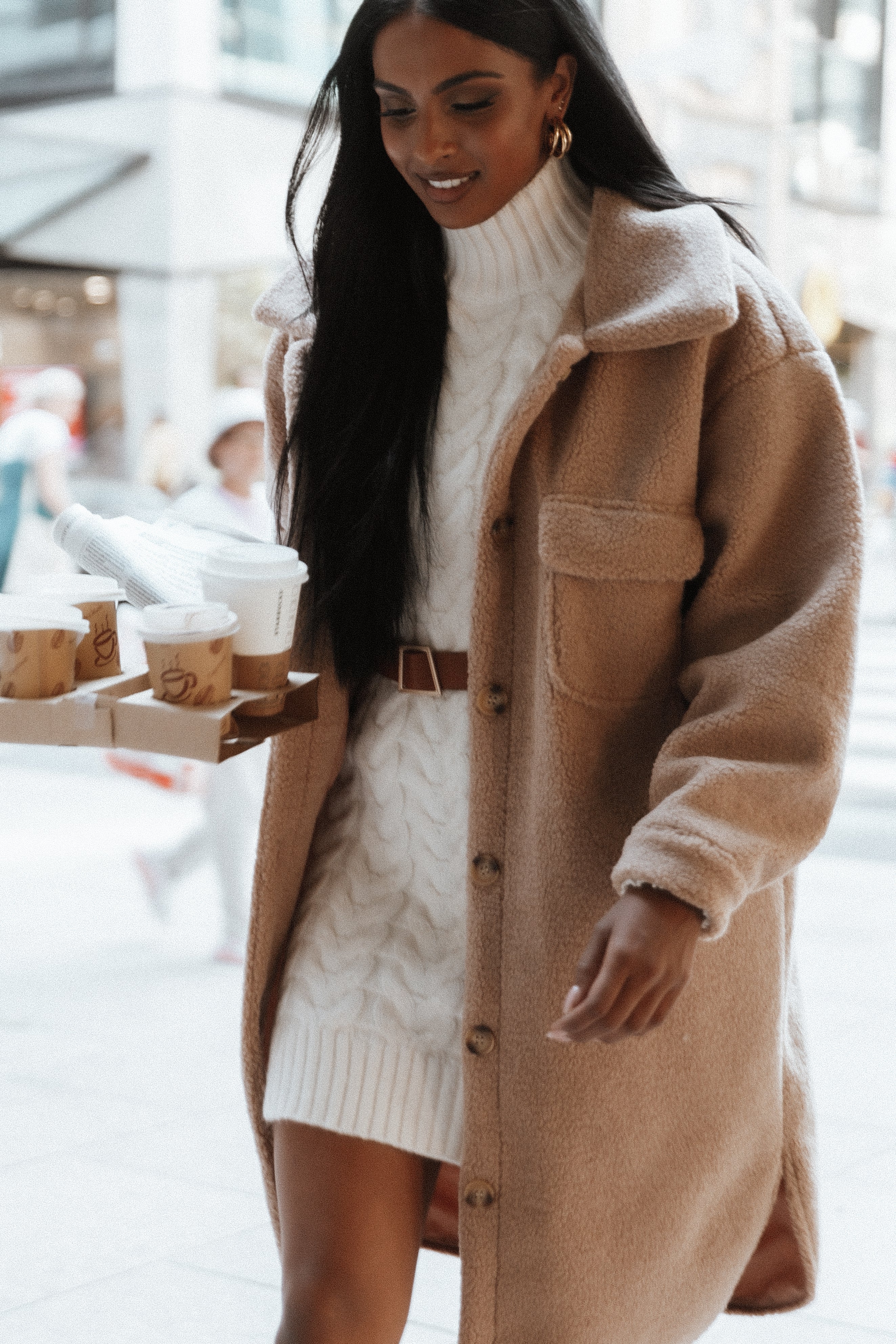 Step into your cooler days in style in our Cozette Dress. This cream, cable-knit design offers a cozy yet relaxed fit. Its high turtleneck and ribbed hem, falling just above the knee, will keep you warm and stylish throughout the day.