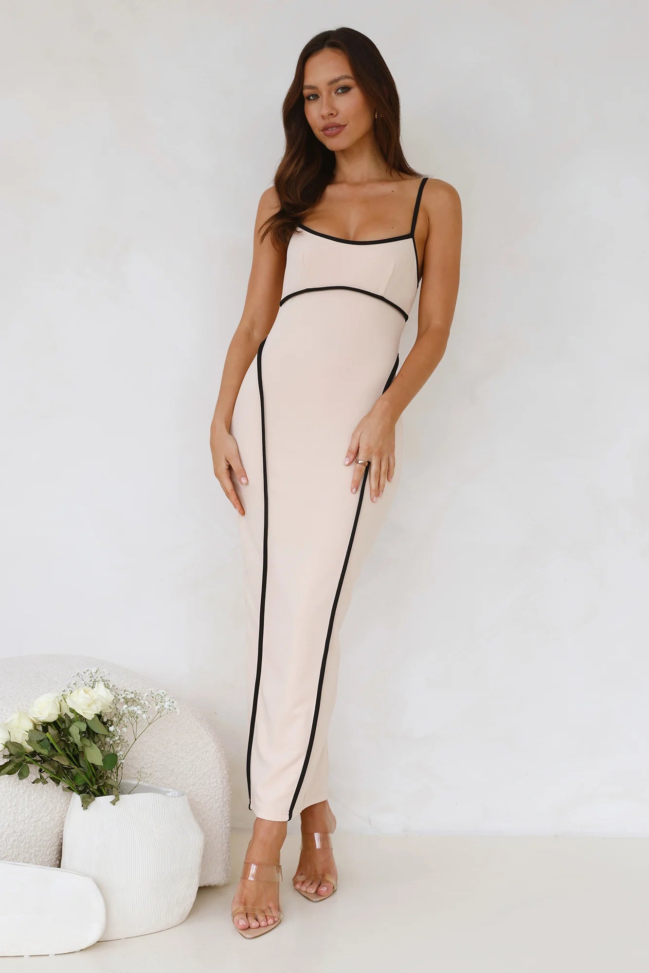 Lovely, feel your confidence boost in the Elite Touch Maxi Dress. Featuring a black trim, a scoop neck and a straight silhouette that gives sophisticated vibes. Style with heels for all the likes.