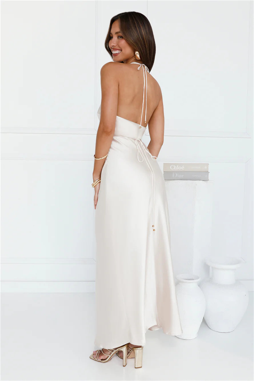 Set trends in the Endless City Halter Satin Maxi Dress. Featuring a gorgeous V-neck, halterneck tie and crisscross design. Style with heels and curls for a dreamy 'fit.