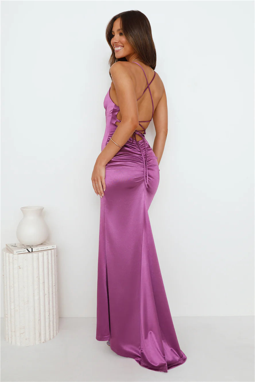 Enter the room in the Events Of Class Satin Maxi Dress. Featuring a gorgeous crisscross back design and a dreamy silhouette. Style with heels for an extravagant 'fit.