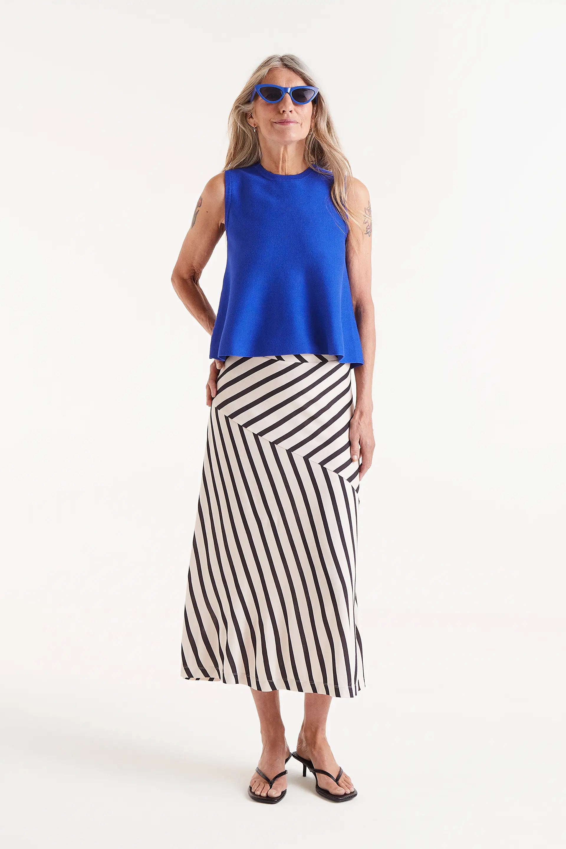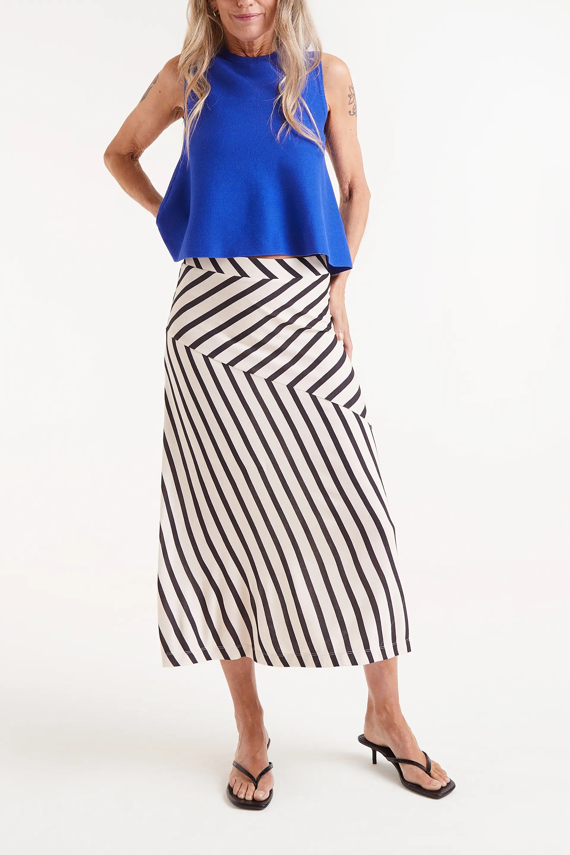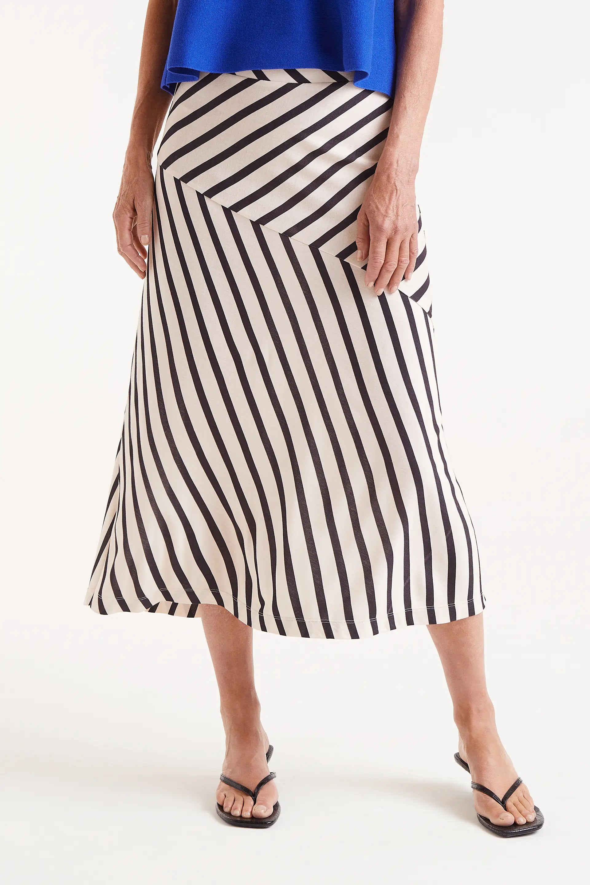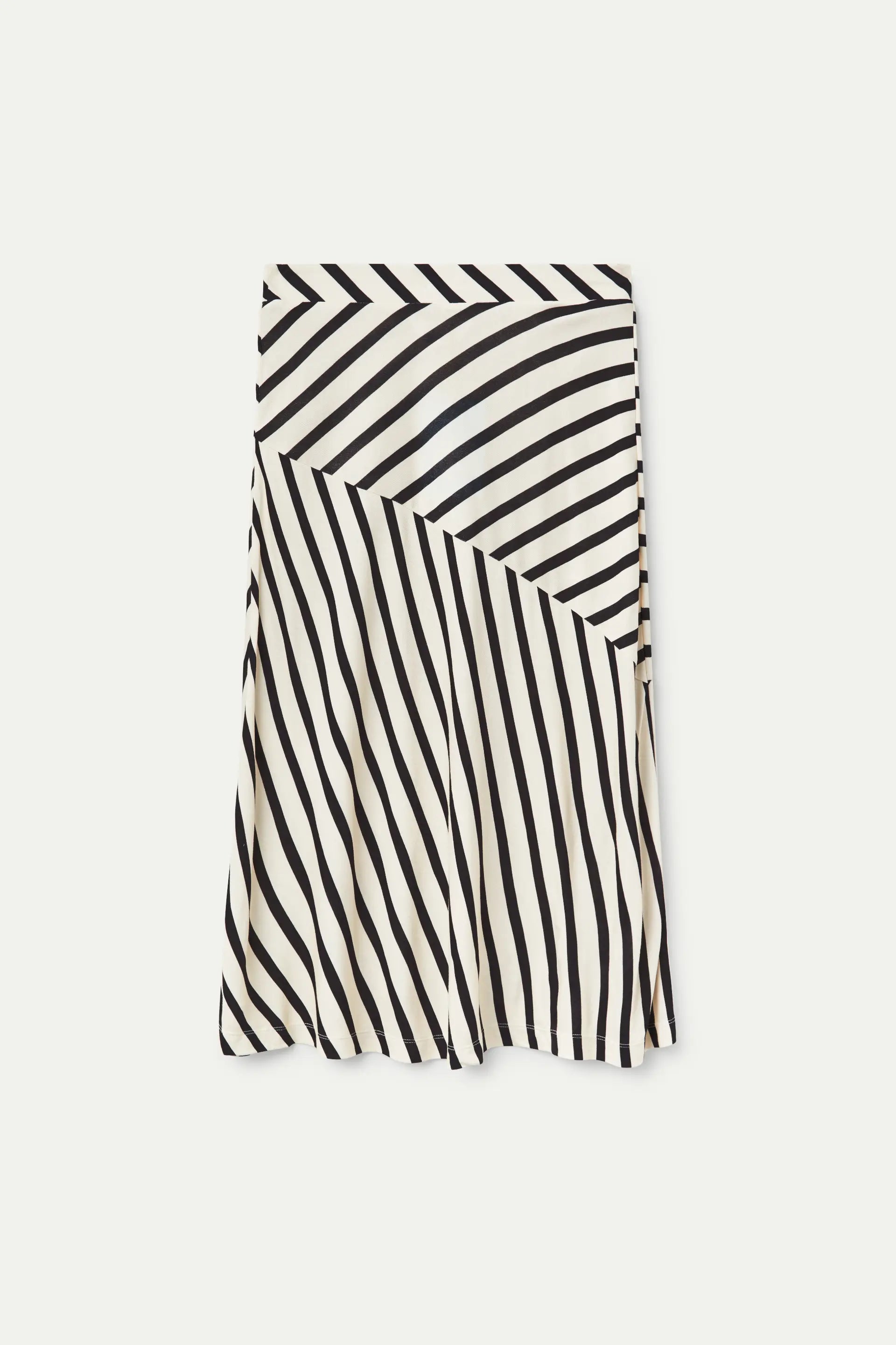 Falda midi en tejido jersey de viscosa con estampado de rayas Piano. Con cintura fija de tiro medio. Modelo con corte oblicuo.