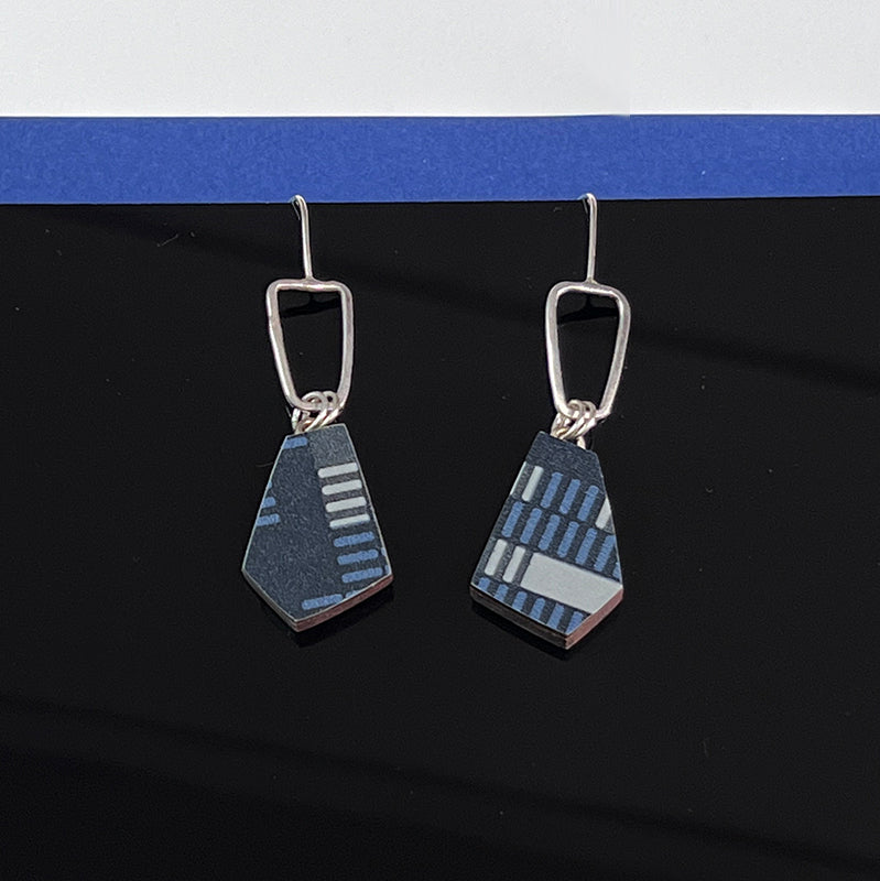 These stunning printed blue and gray laminate on rich walnut on handmade sterling wire ear hangers are 1 7/8 inches long. S