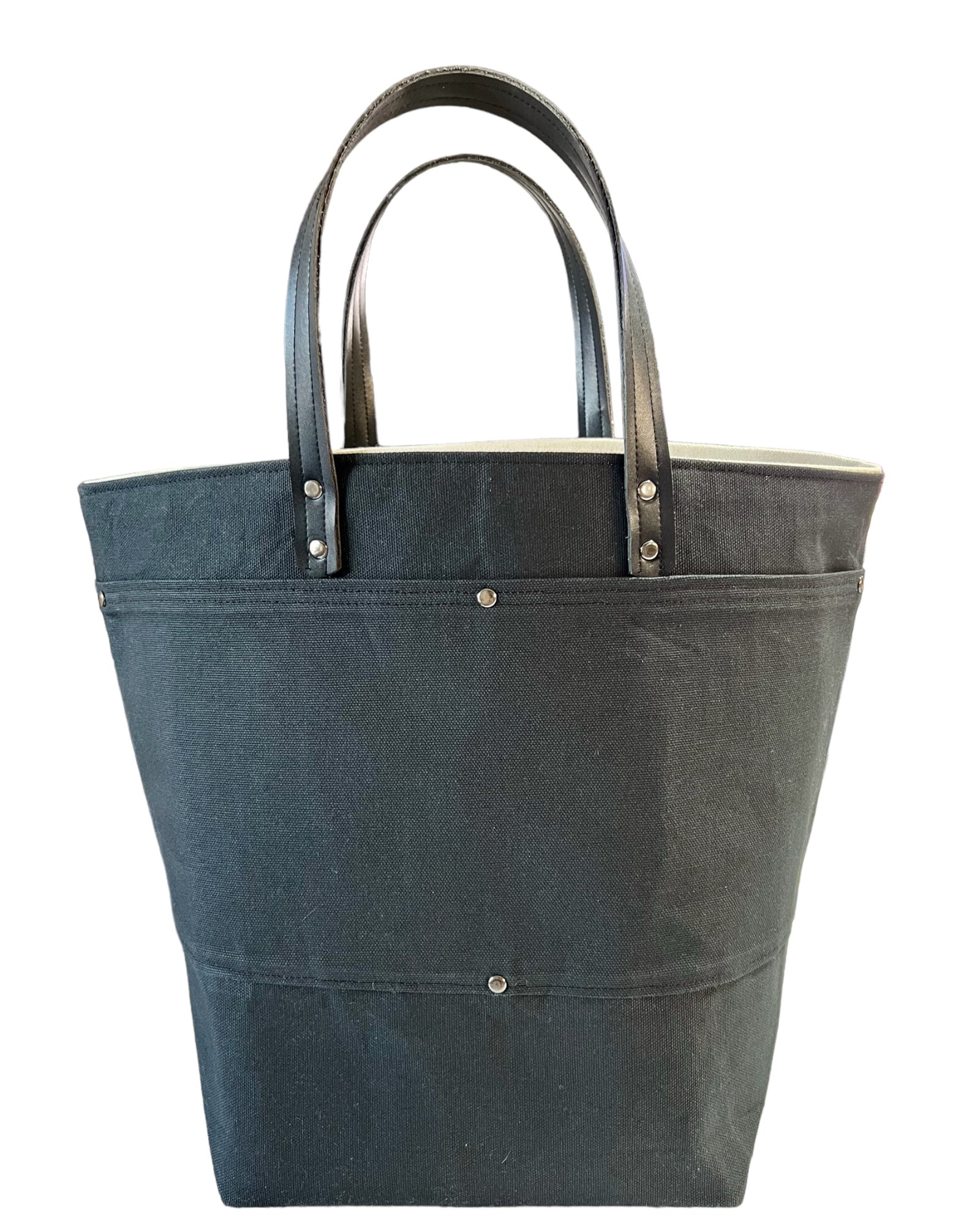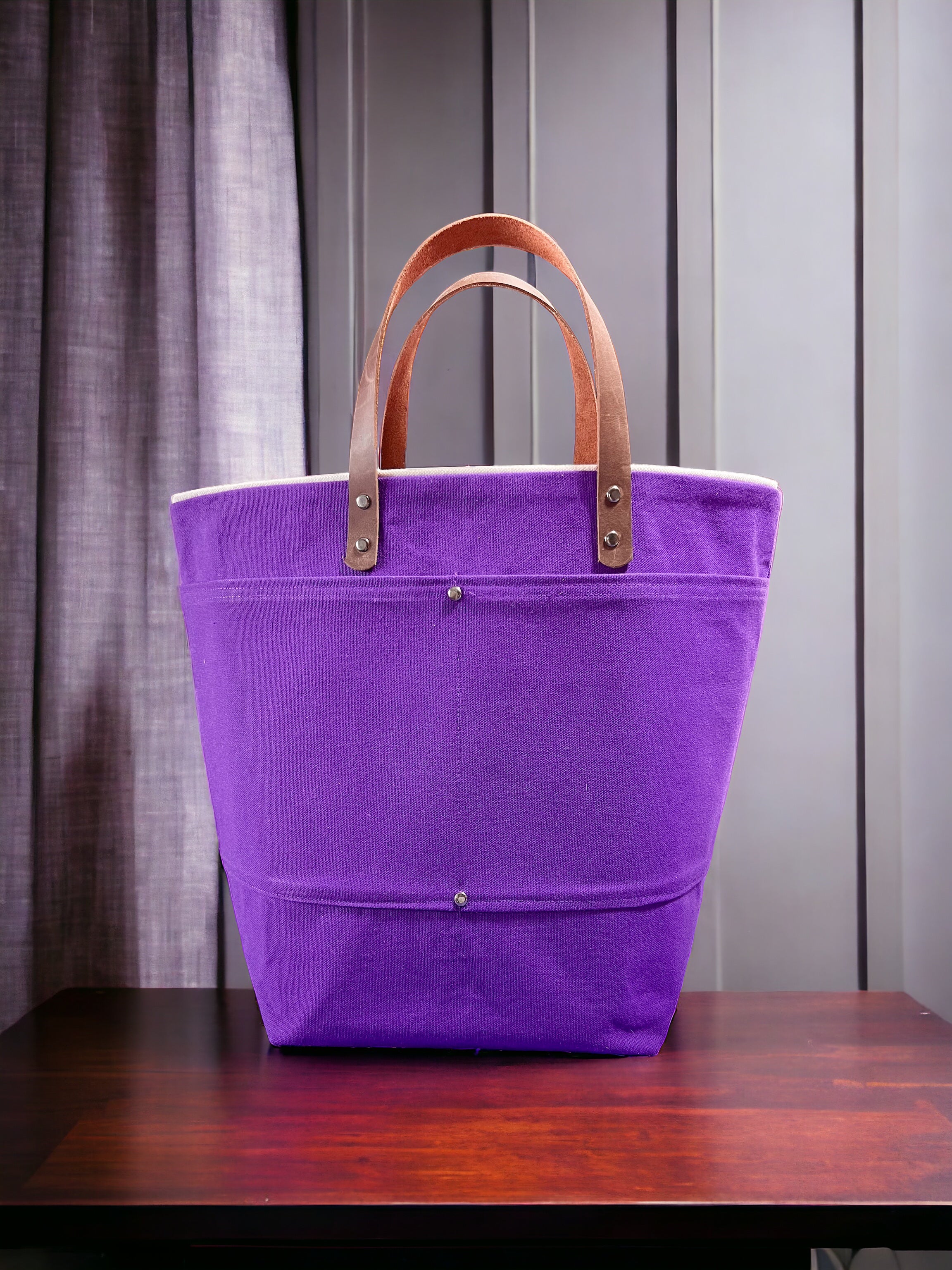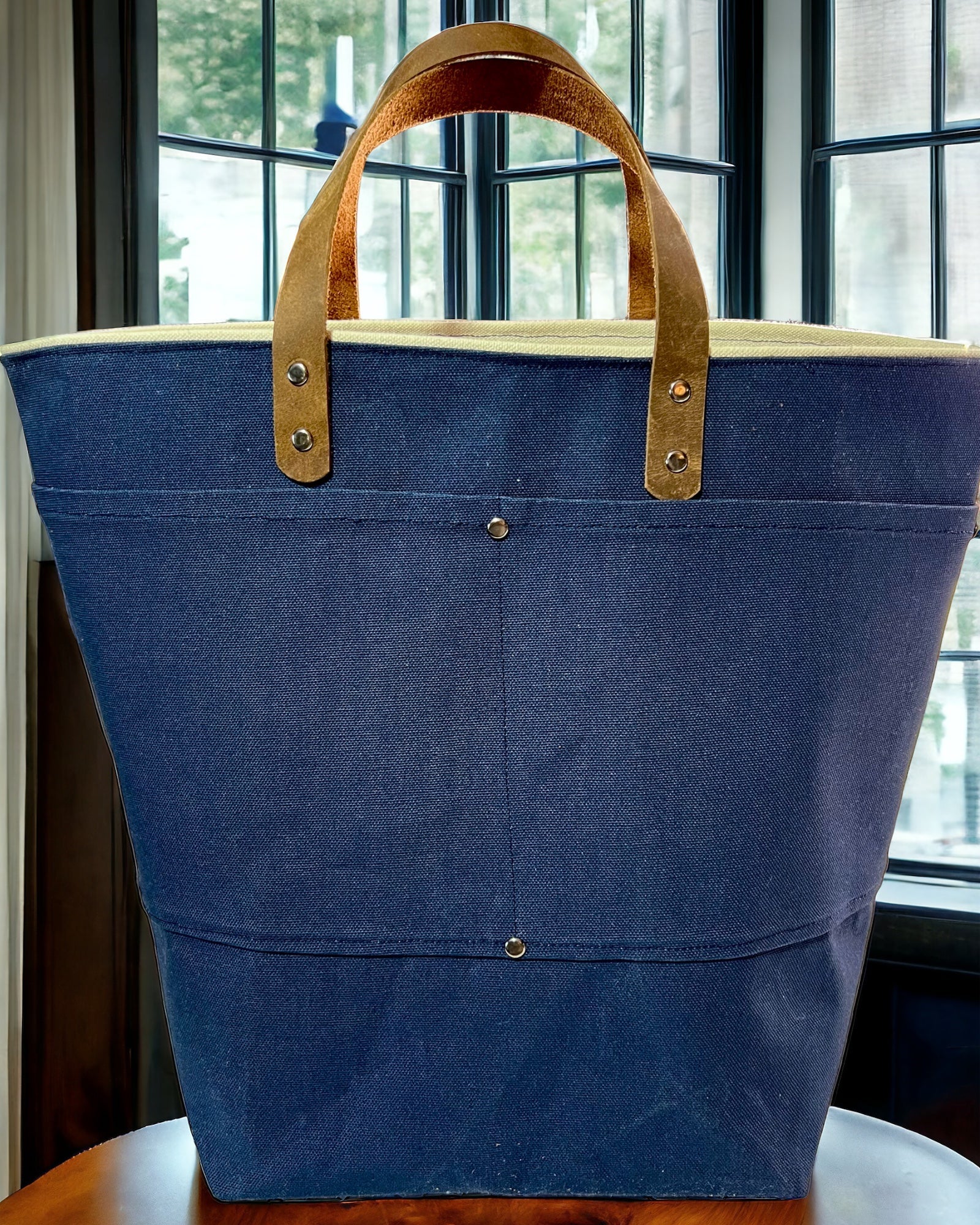 The Gussie bag is designed to effortlessly fit a sweater or large shawl project, making it a practical choice for any crafting enthusiast. With sturdy construction and supportive leather handles, it can also serve as an everyday bag for those who are always on the go. Plus, its practical design includes 2 interior pockets and ample space to store your notions, phone, and iPad without compromising its structure. This bag is the perfect balance of function and style, measuring 14" tall, 16.5" wide at the top, 9" wide at the bottom. The 8.5" leather handles add the perfect touch of elegance to this on-the-go friendly bag.