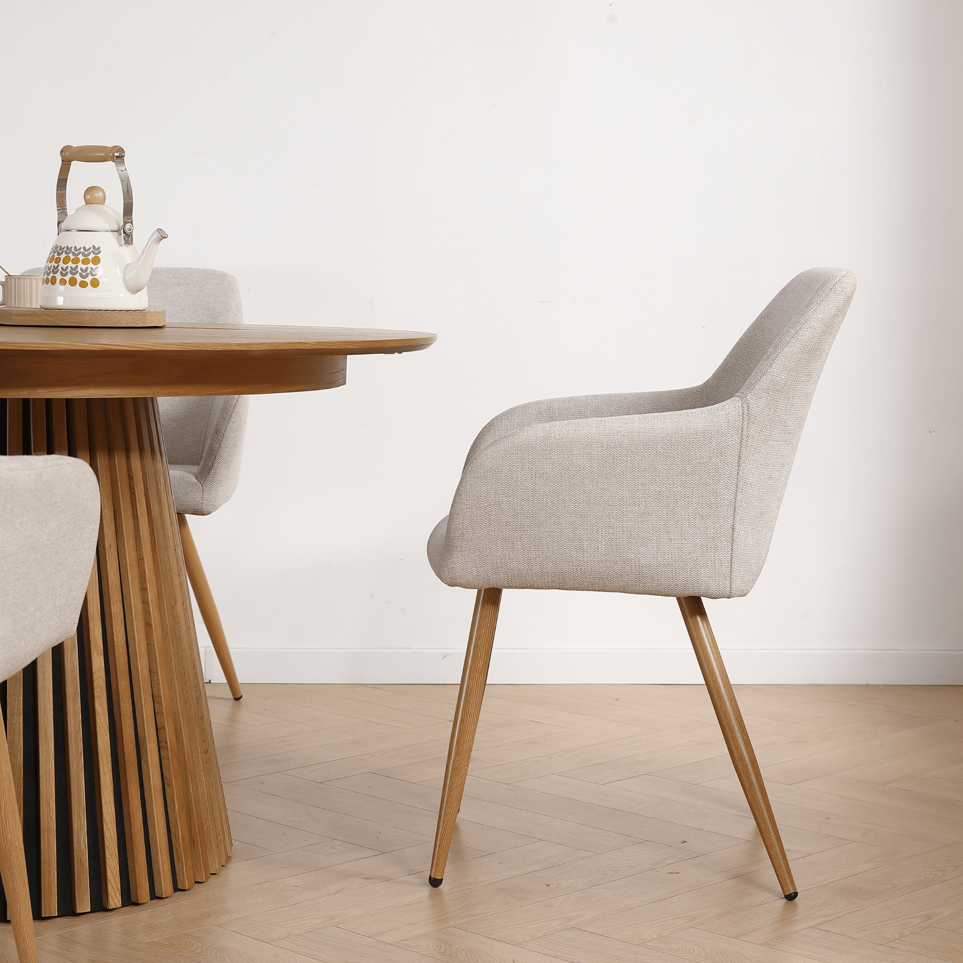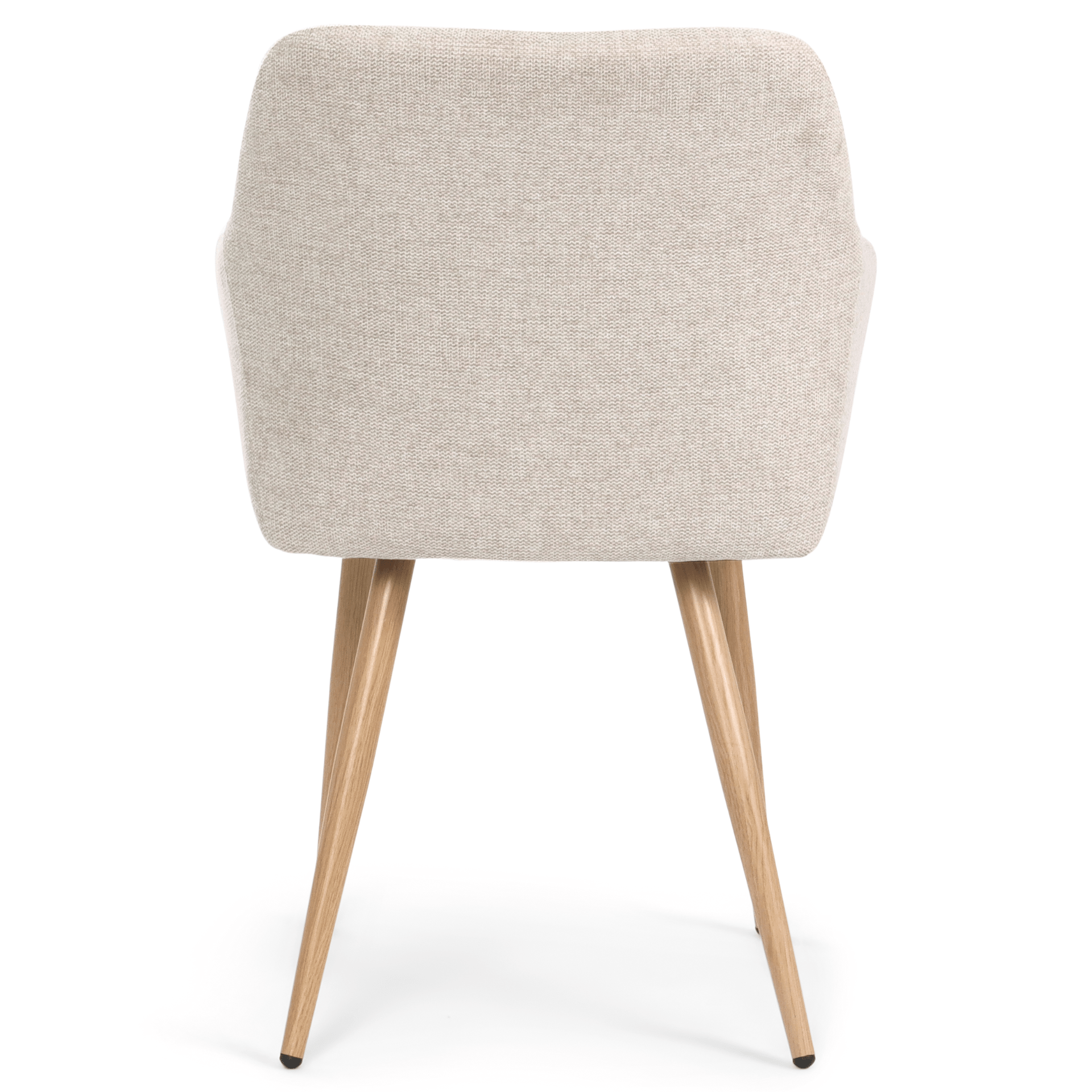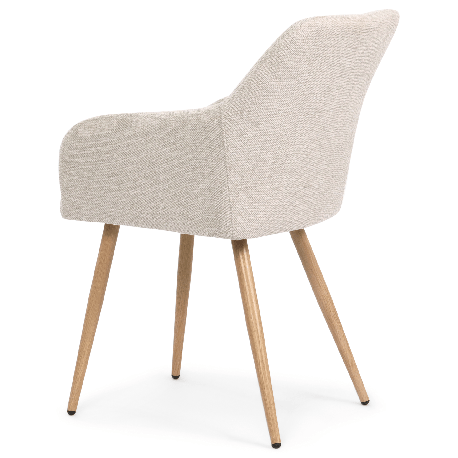 Dens bløde beige tekstil og metalben i egelook skaber en indbydende atmosfære. Den strukturerede polstring sikrer komfort. Fra middage med familie og venner til stille øjeblikke alene, tilbyder denne stol enestående komfort og funktionalitet. Den neutrale farve, simple og moderne udtryk gør stolen perfekt til enhver indretning.
