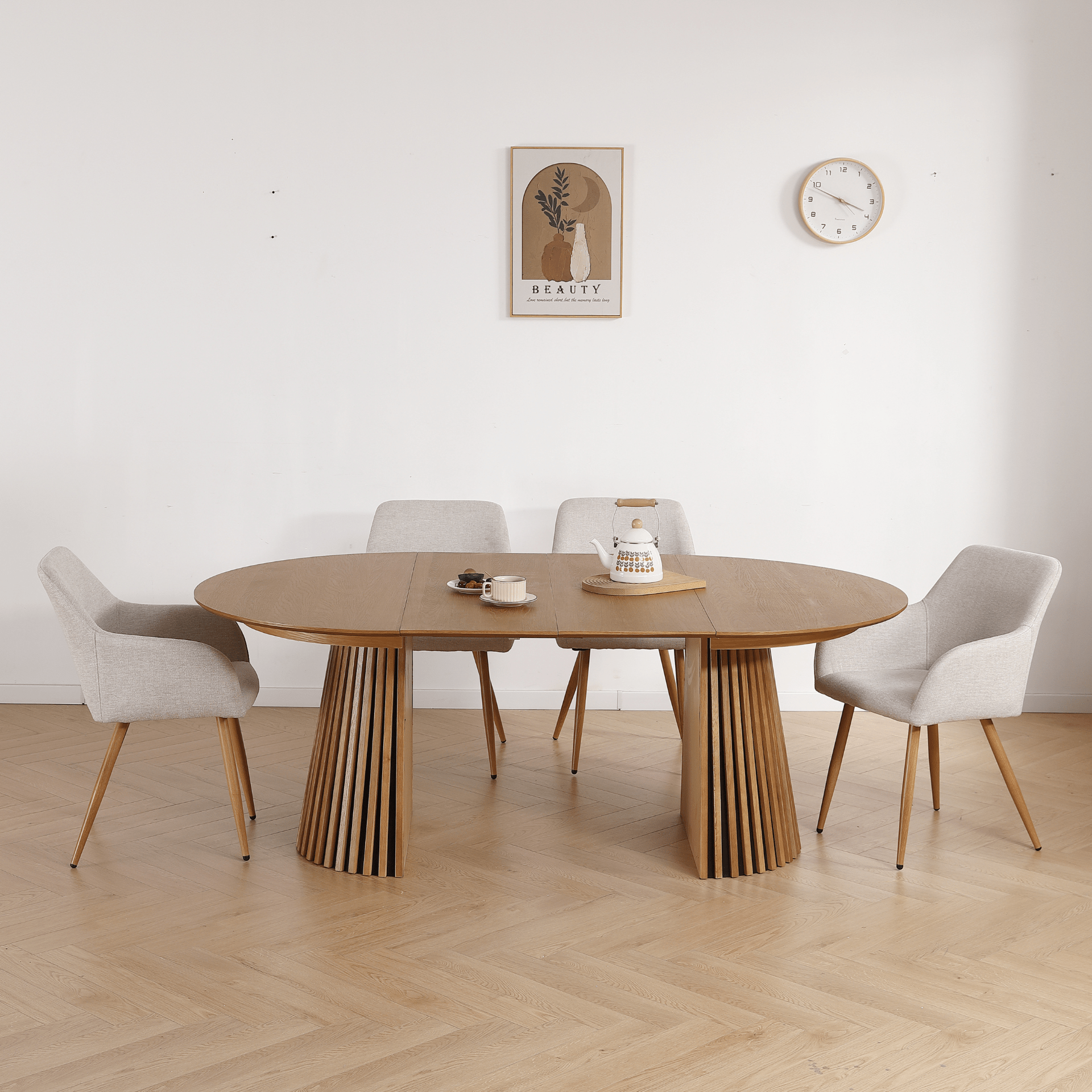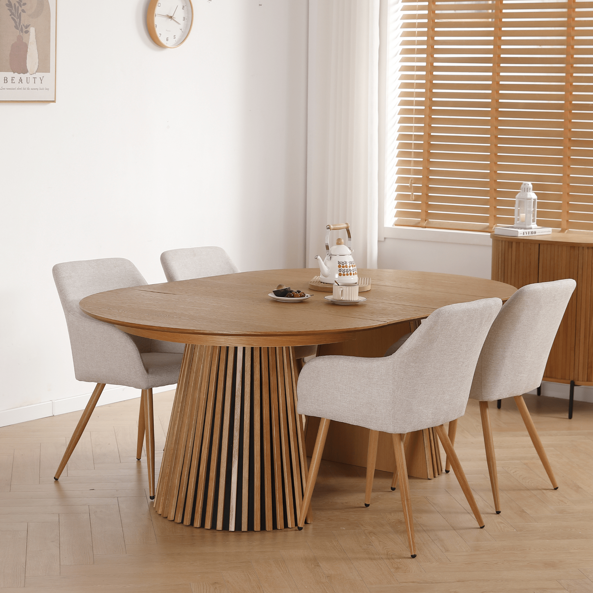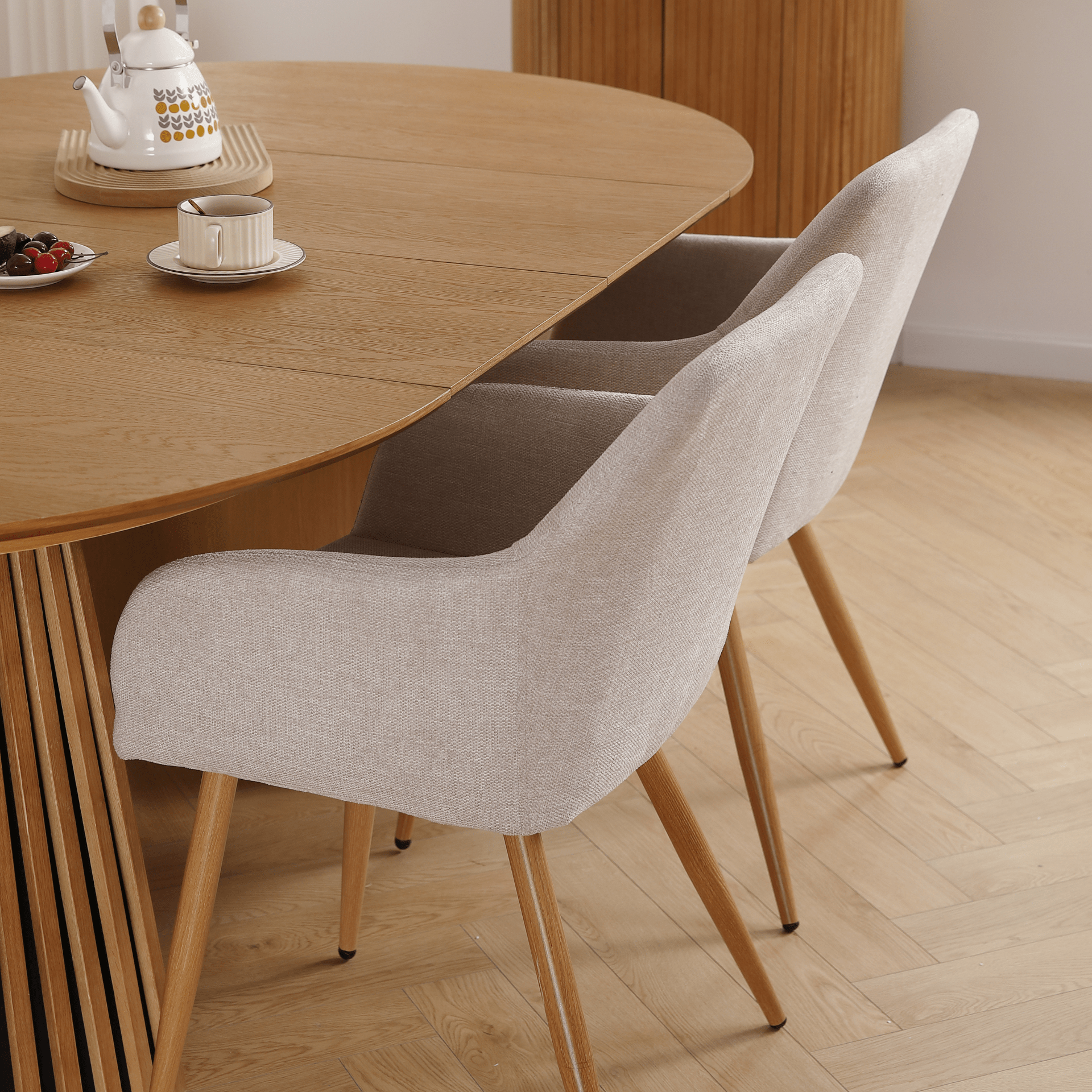 Dens bløde beige tekstil og metalben i egelook skaber en indbydende atmosfære. Den strukturerede polstring sikrer komfort. Fra middage med familie og venner til stille øjeblikke alene, tilbyder denne stol enestående komfort og funktionalitet. Den neutrale farve, simple og moderne udtryk gør stolen perfekt til enhver indretning.