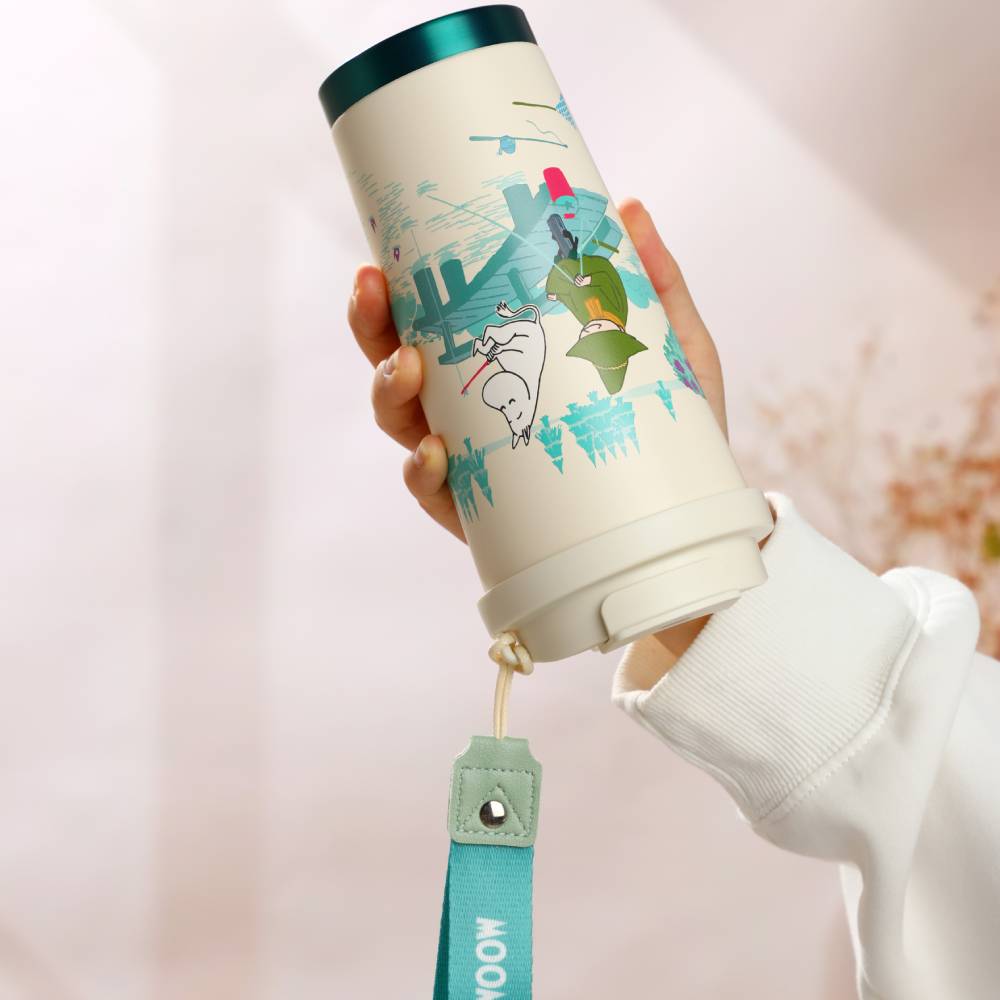 Uroczy kubek termiczny z Muminkami z pięknym, tłoczonym wzorem. Wewnętrzna i zewnętrzna warstwa kubka wykonana jest z wysokiej jakości stali nierdzewnej. Kubek nadaje się zarówno do gorących, jak i zimnych napojów. W tym modelu można pić przez otwór w pokrywce lub używać dołączonej rurki. Dodatkowo kubek wyposażony jest w pasek do noszenia. Pojemność 580ml. Dostarczany w pudełku.