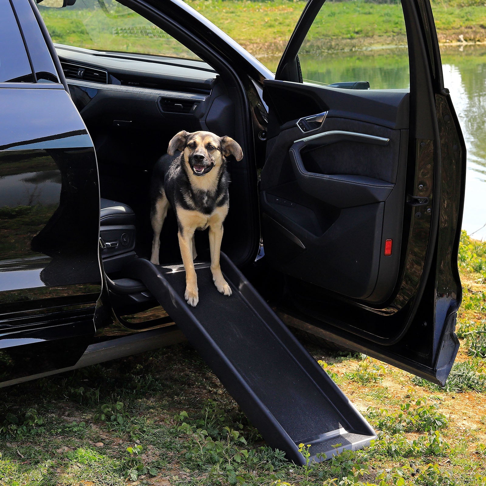 Mit dieser Hundeleiter kannst du deinen Vierbeiner beim Einstieg ins Auto oder beim Aufstieg von Treppen unterstützen. Besonders geeignet ist die Einstiegshilfe für Tiere mit Gelenk- und Rückenproblemen oder höherem Gewicht. So kann dich dein Liebling sowohl unterwegs als auch in deinem Zuhause immer begleiten. Die Rampe ist mit einer rauen und rutschfesten Oberfläche ausgestattet, damit dein Hund nicht wegrutscht und immer festen Halt behält. Natürlich ist die Tiertreppe auch für Katzen und andere Kleintiere nutzbar.