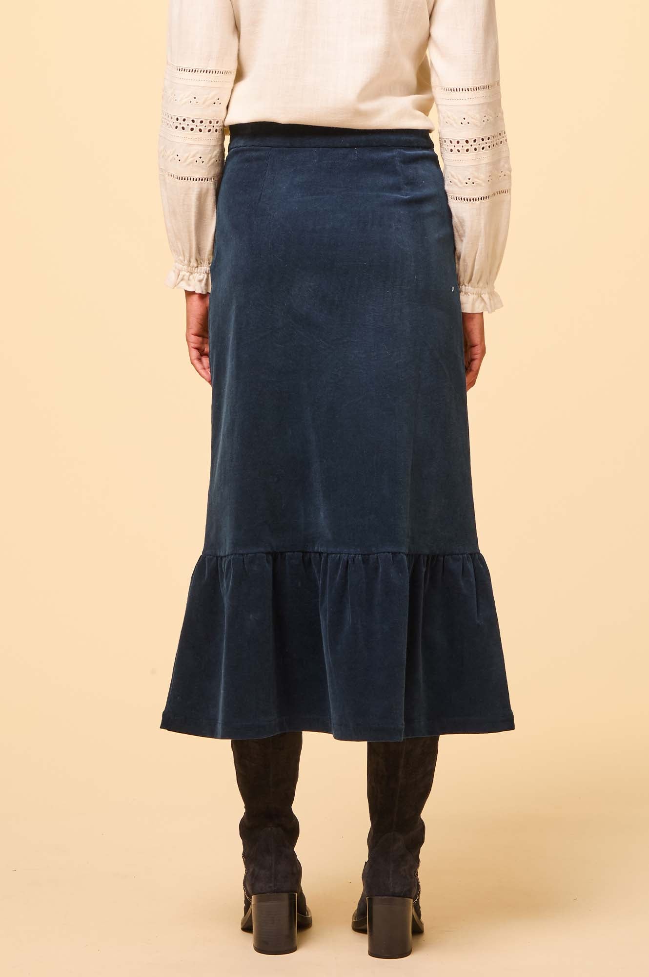 Made from organic cotton needlecord with stretch; Lori has a subtle A-line silhouette with a softly gathered tier. Featuring a flat waistband and side zip for a clean fit; Lori is perfect for dressing up with our Satin Lace Cami, or style with one of our cosy knits and boots for an everyday look.