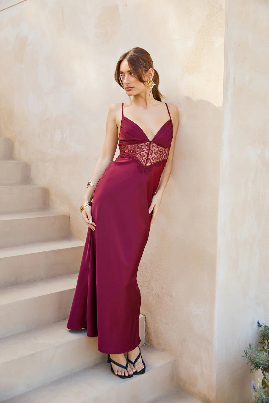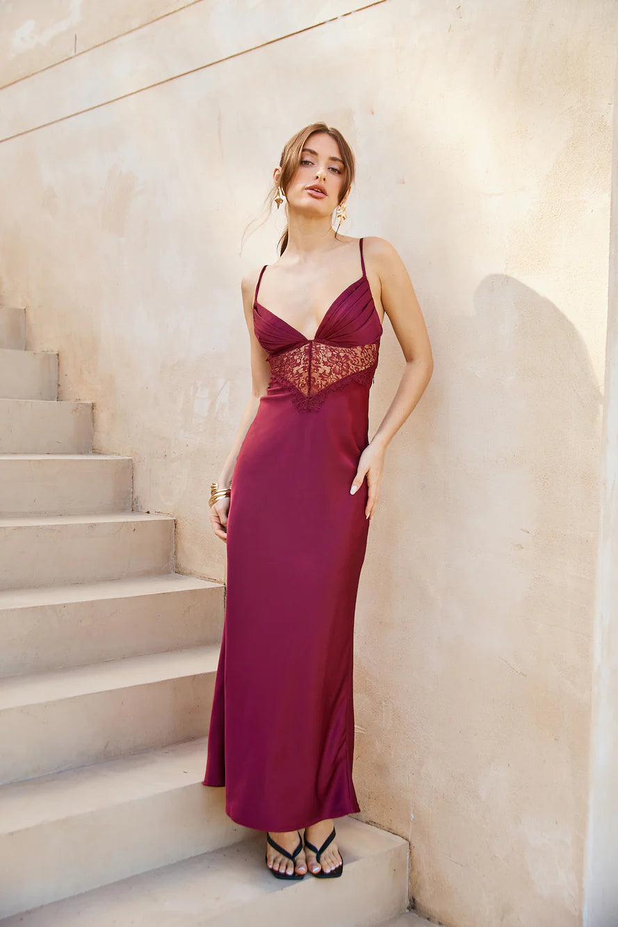 Enter with class in the Lovers Engagement Silk Maxi Dress. Featuring a lace bodice, a silky satin silhouette and an elastic back. We're in love with this dress for all our formal affairs. Style with heels for a 'fit you'll get compliments on.