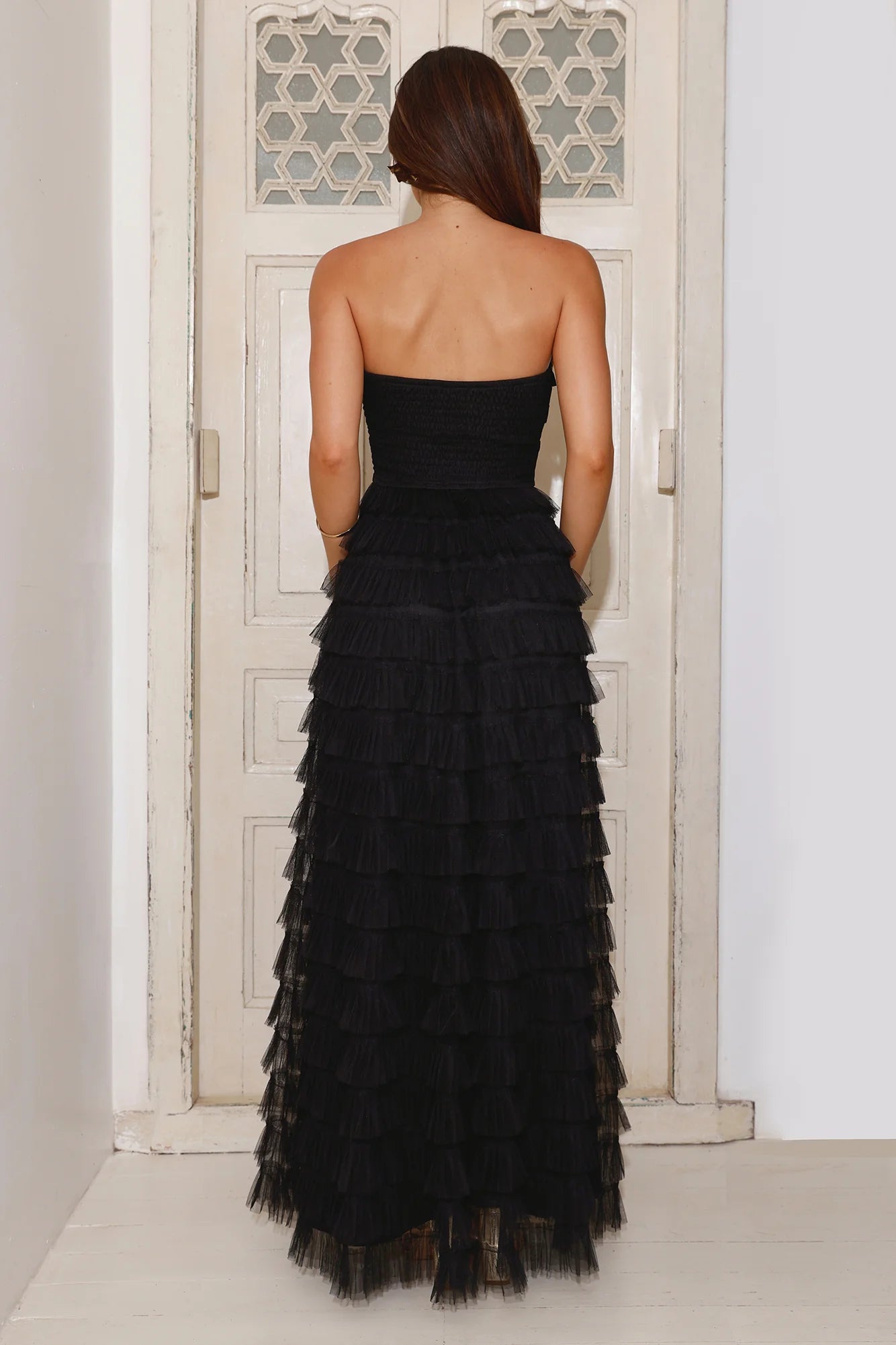 Romanticise every moment in the Lovers In Paris Strapless Tulle Maxi Dress. Featuring a gorgeous tiered frill skirt, a twist detail to the top and an inner grip. Style with heels for an unforgettable 'fit.