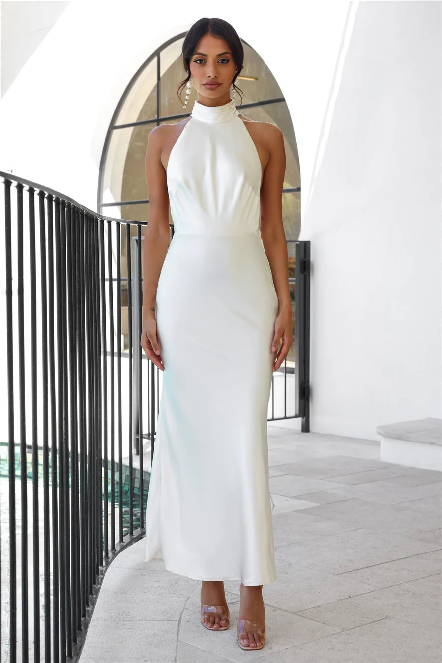 Steal the compliments at your fancy event. The Luxurious Lady Satin Maxi Dress features a high neckline and a gorgeous open back with pearl strings. Style with heels for a high-end look.