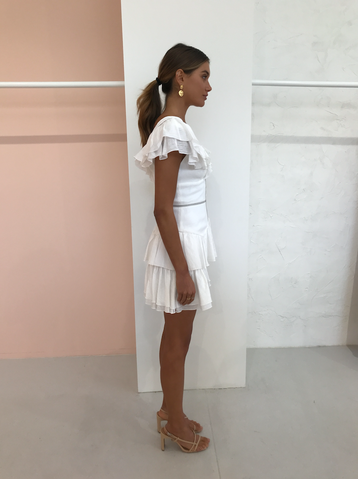 This amorous design is cut in stretch linen with delicate paneling throughout and lightweight ruffles cut in sheer, textured linen. A flattering silhouette, this slim fit bodice flows into an A-line tiered skirt and finishes at mini length.