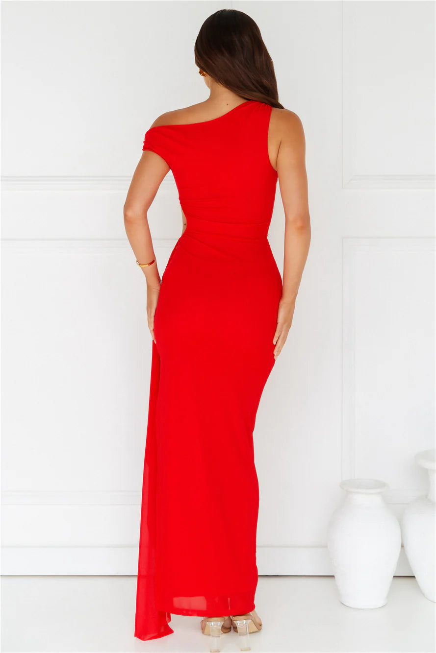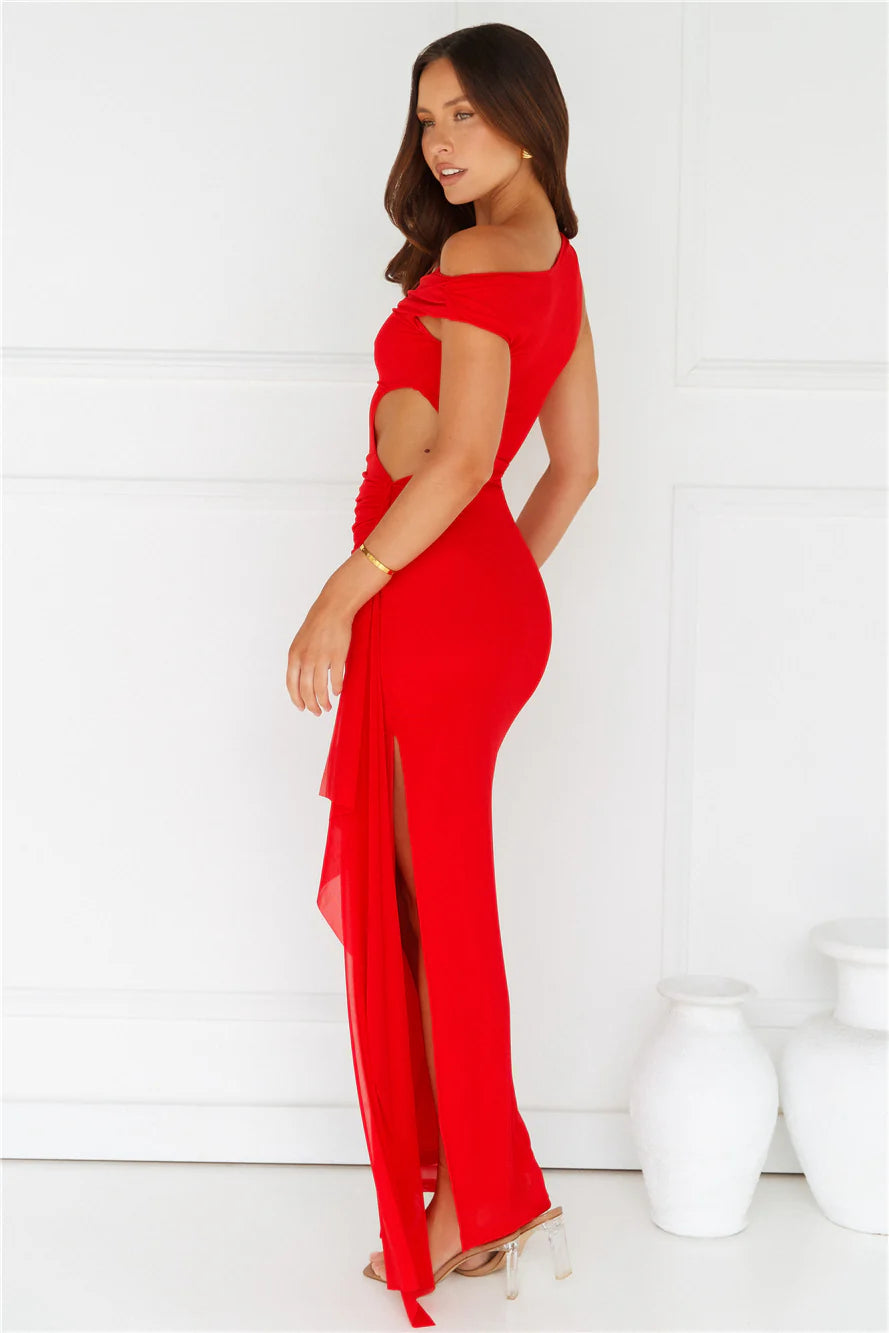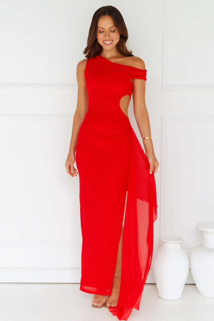 It's giving IT girl vibes. The Mara Maxi Dress by RUNAWAY features an asymmetrical neckline, a side waist cut out, and a side split. Style with heels and curls for a statement 'fit you'll get compliments on.
