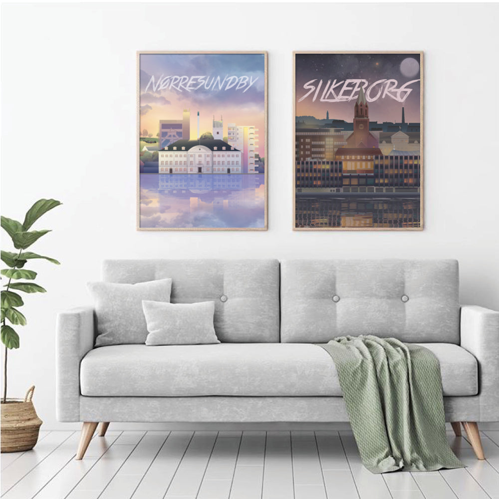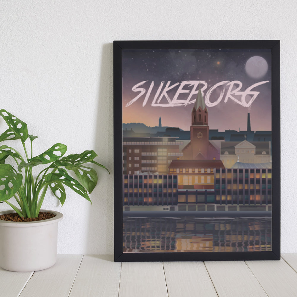 En smuk byplakat af . Her har han fanget de flotte bygningsværker fra Silkeborg i en samlet plakat over byen.