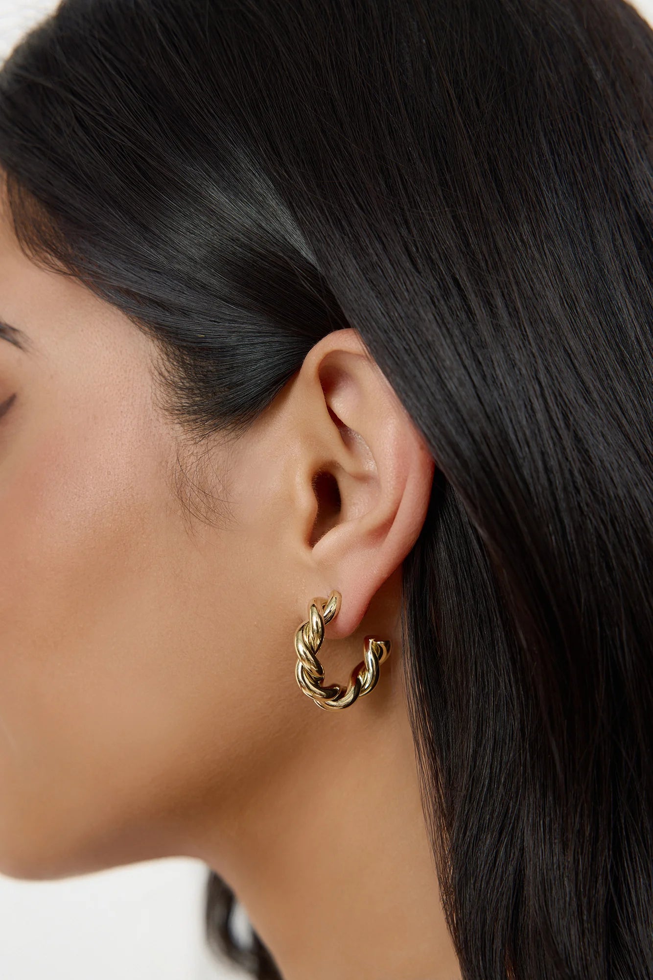 The Meet Me Here Hoop Earrings feature a chic twist design that adds a modern edge to the classic open hoop style. With a radiant gold finish, these earrings are perfect for elevating any look with a touch of sophistication and effortless charm.