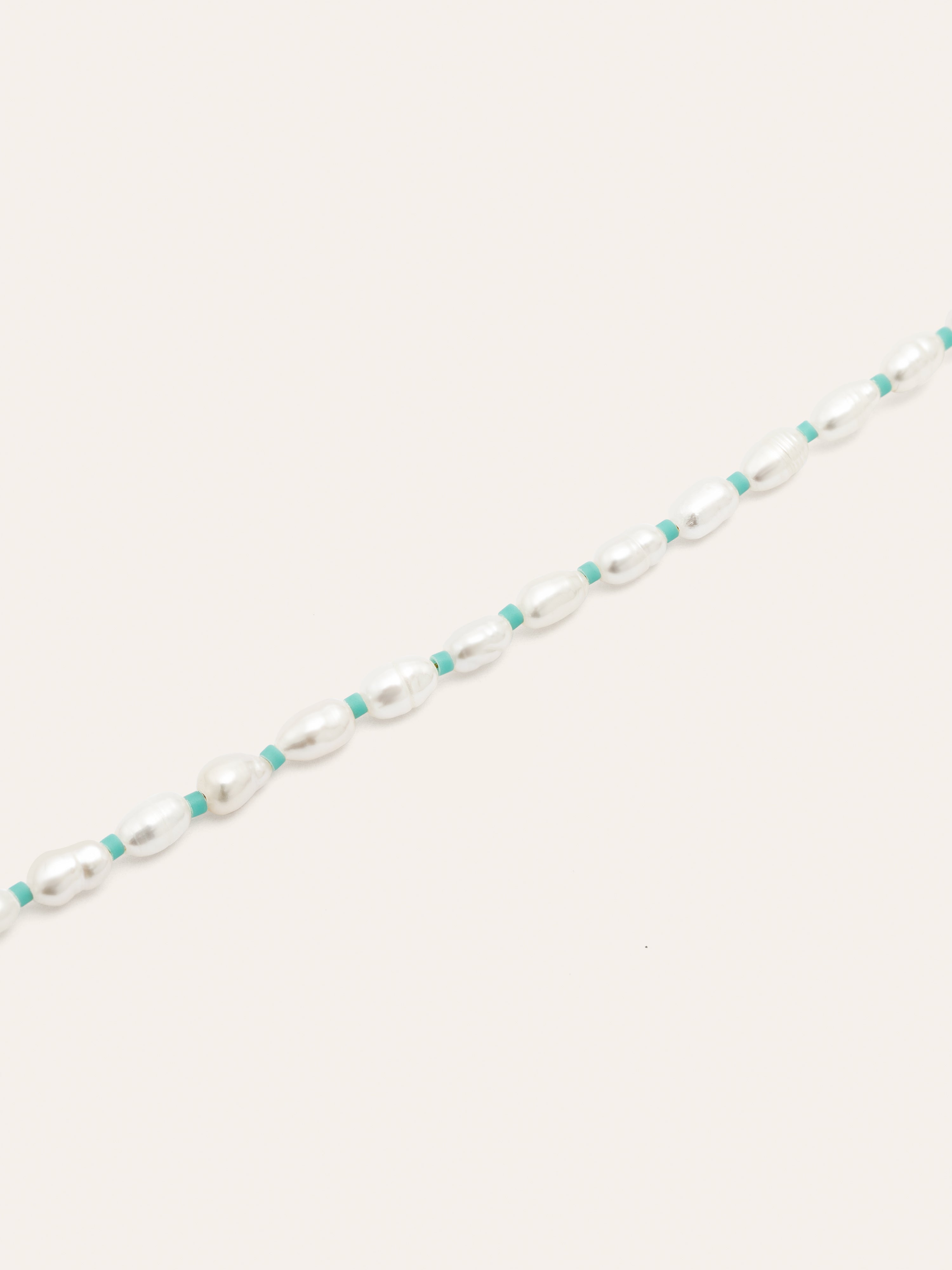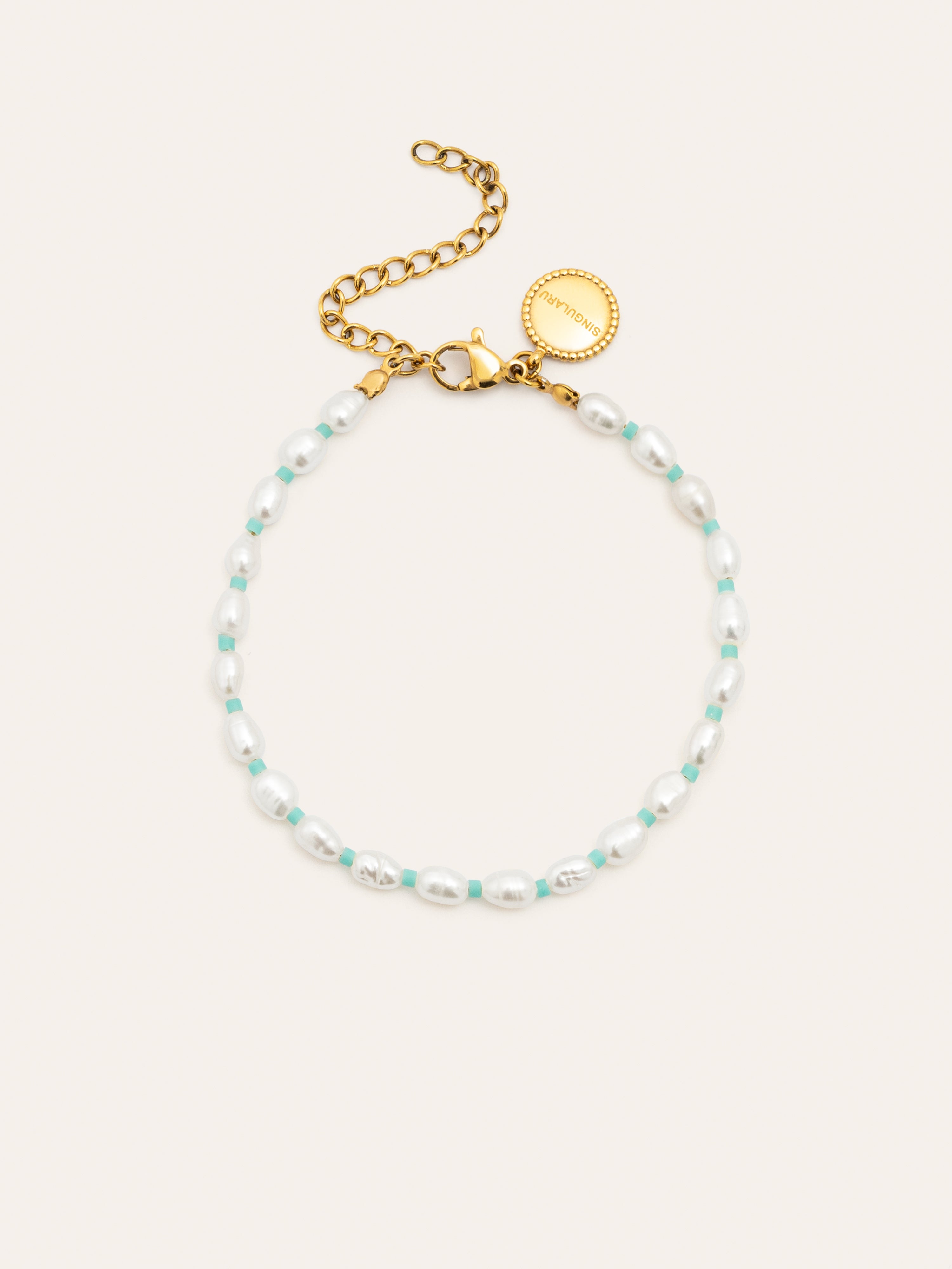 La Pulsera Pompeya Turquesa de acero bañada en oro, es una pulsera de perlas pequeñas ovaladas con detalles turquesas ideal para añadir a tus looks de verano. 🦪