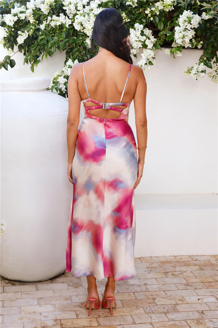Girl, this dress is giving the dreamiest vibes. The Rainbow Reverie Satin Maxi Dress features a multi-coloured pattern, a flowy silhouette and an elastic back with a silver clasp. Style with heels for a look we're obsessed with.