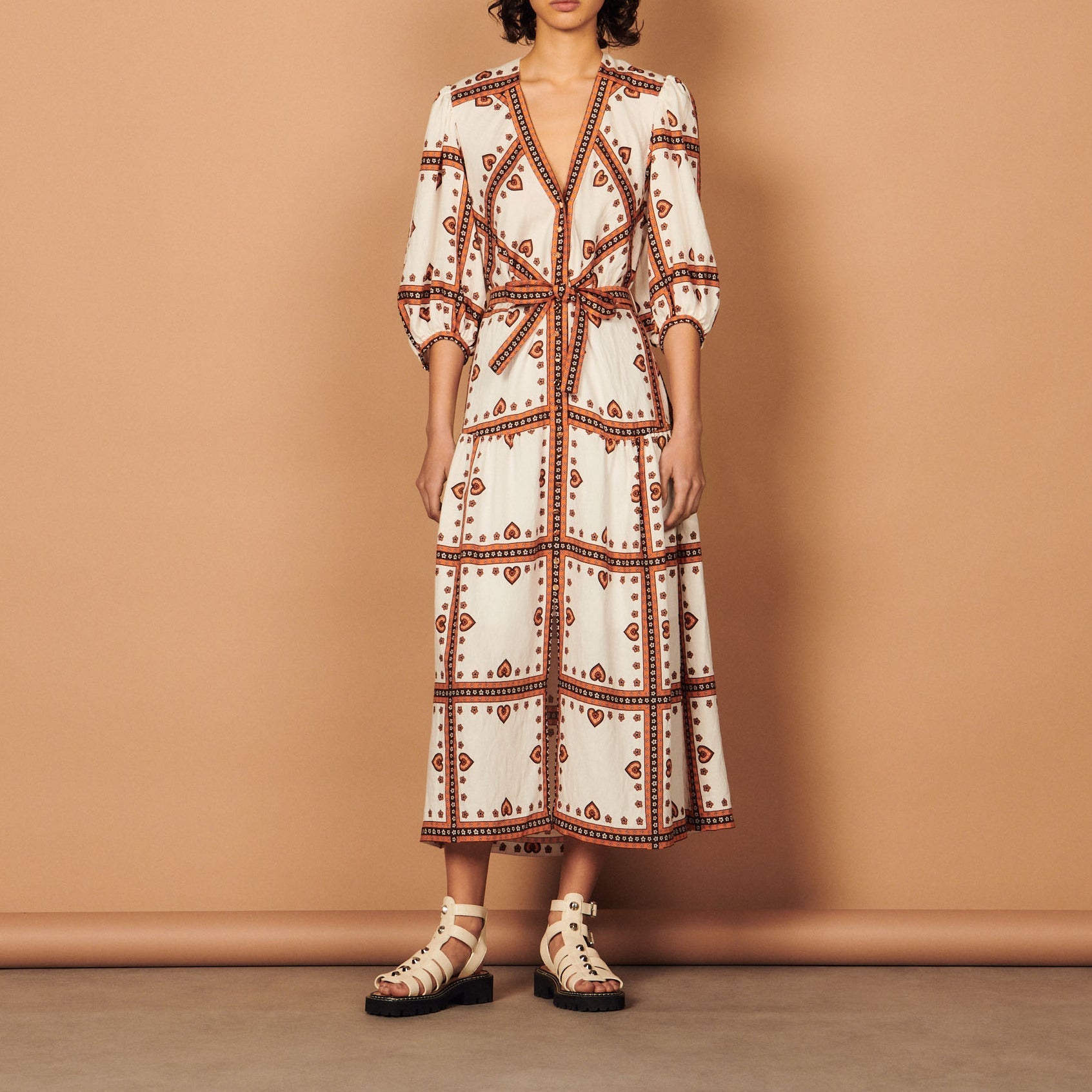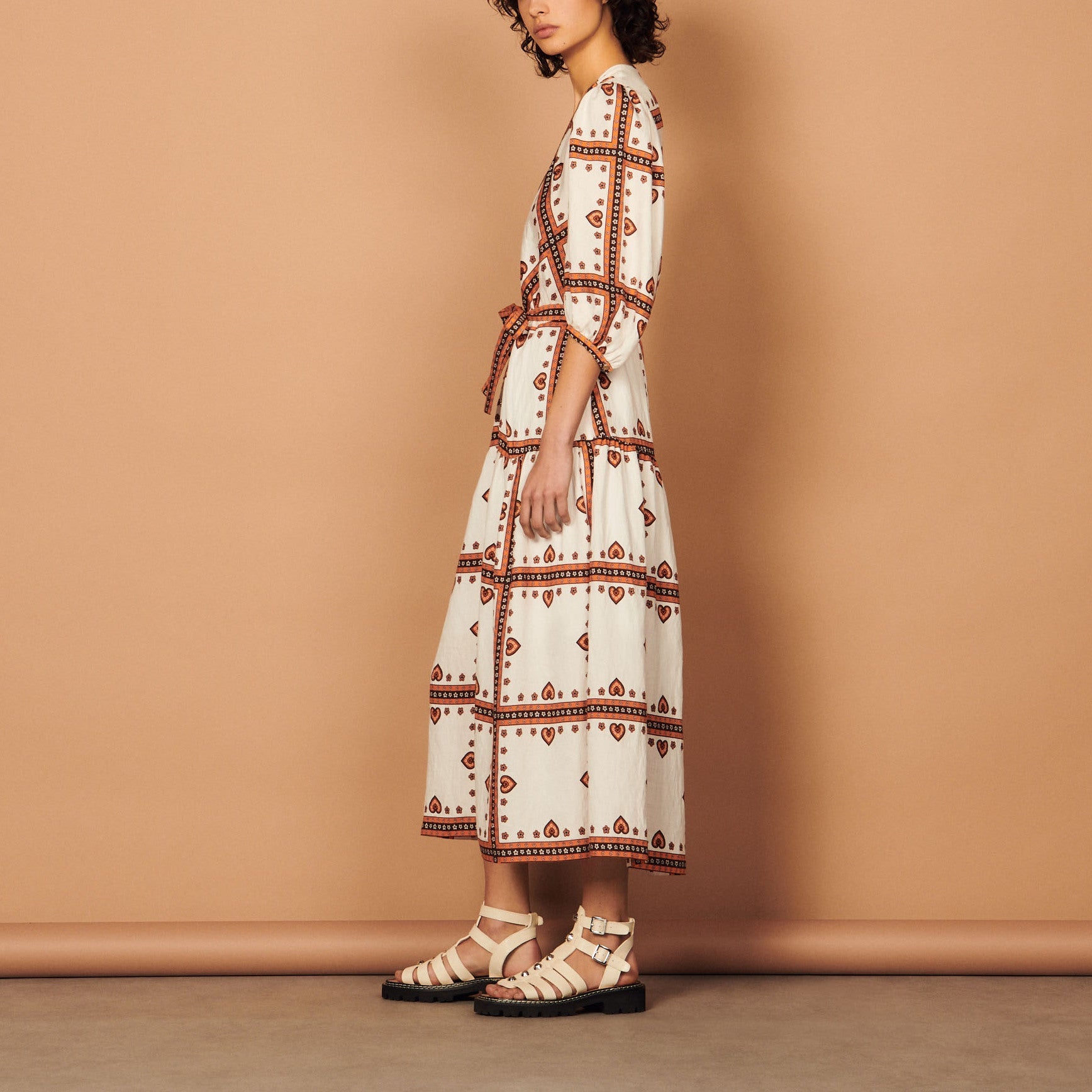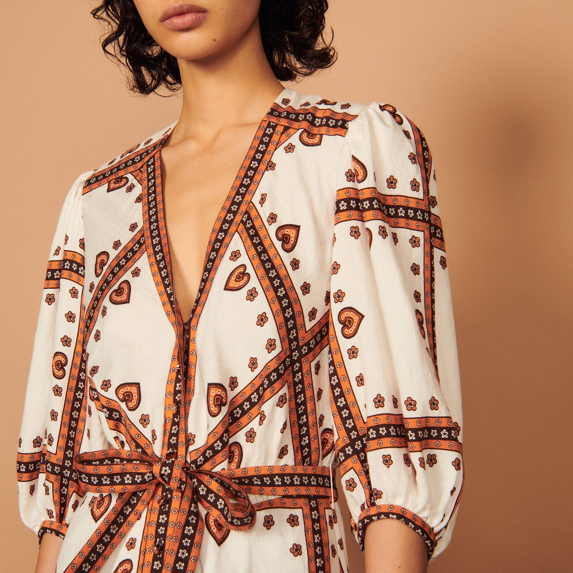 Robe longue à manches 3/4 volumineuses, évasée à la taille et ornée d'un imprimé Bandana. Robe longue imprimé Bandana Sandro Femme Manches 3/4 Découpes froncées à la taille Jupe évasée Ceinture amovible