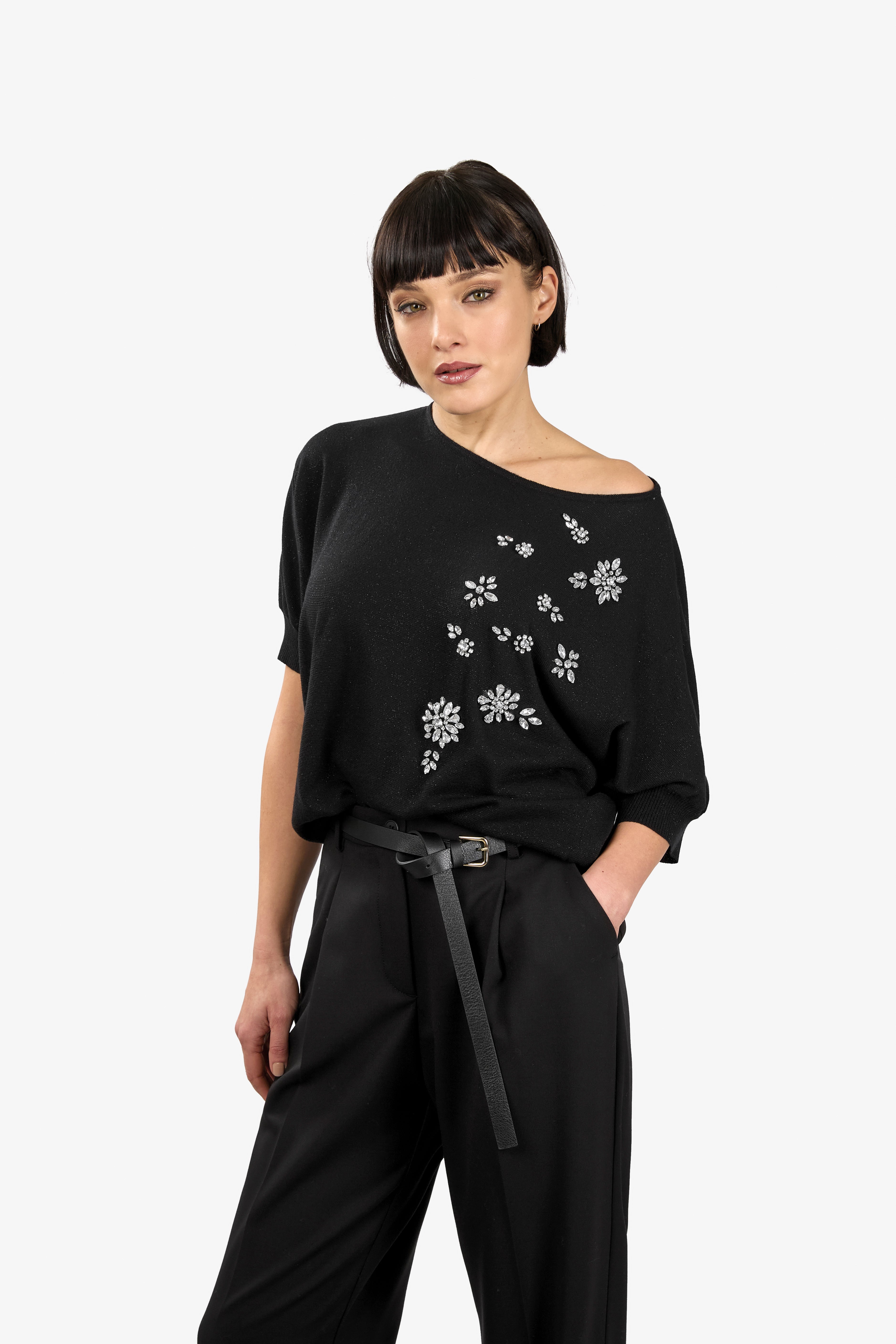 Elevate your wardrobe with this elegant black kimono-shaped sweater, crafted from a delicate lame knit that adds subtle shimmer. Its 3/4 sleeves offer a flattering, versatile fit, while the intricate diamond applique enhances its refined sophistication. Ideal for dressing up any outfit with effortless style.