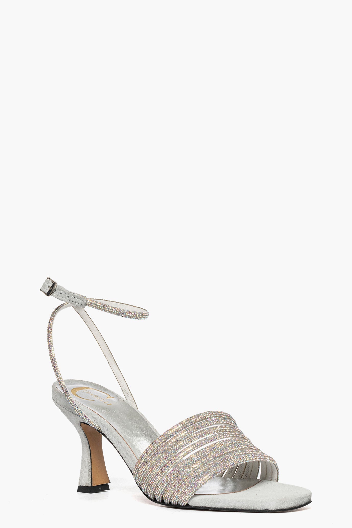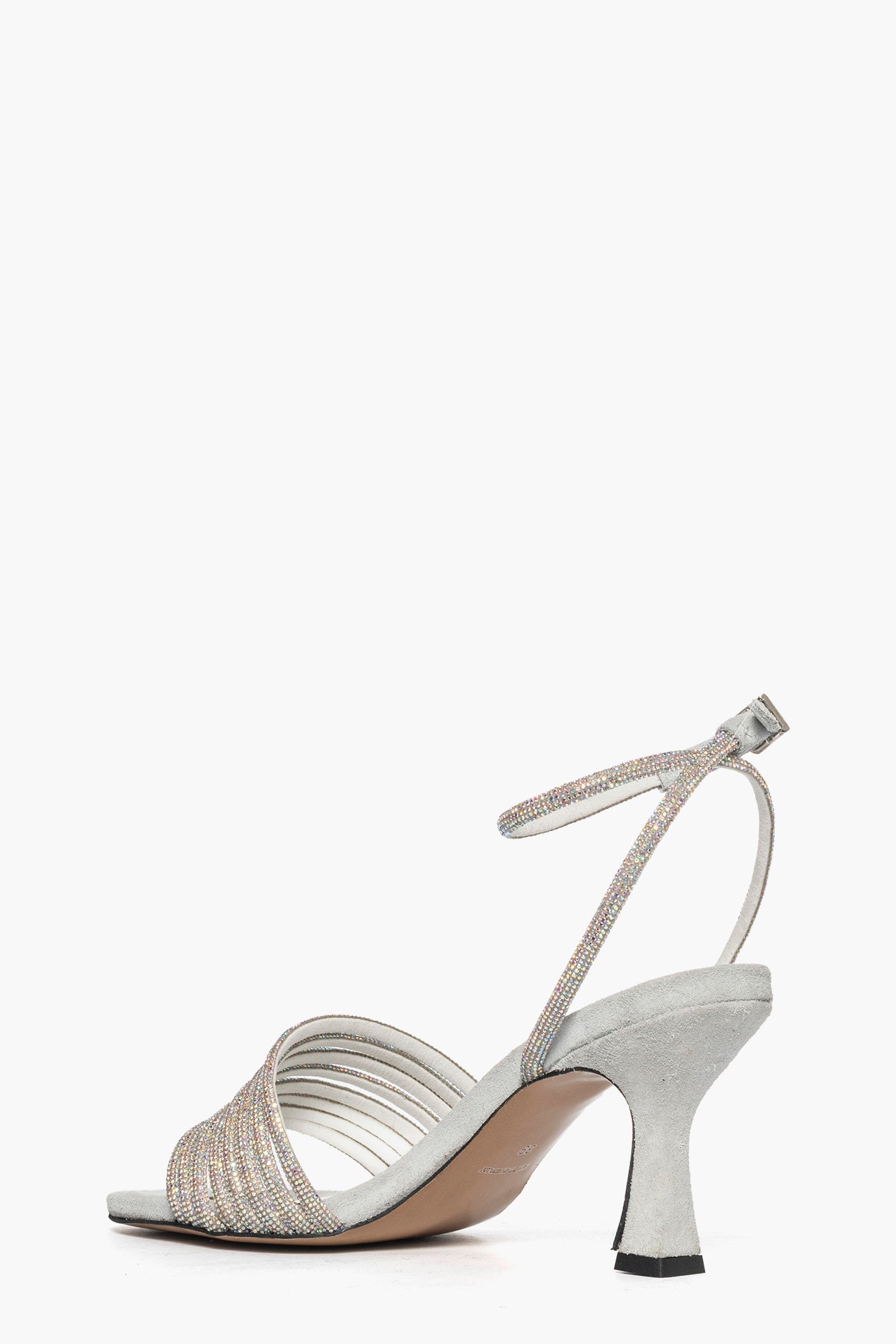 Sandali in camoscio ghiaccio e strass argento boreale, con cinturino alla caviglia regolabile con fibbietta in color argento. Sottopiede in similpelle e camoscio ghiaccio. Tacco rivestito, 8,5 cm. Punta quadrata, calzata regolare. Calzature realizzate artigianalmente, rigorosamente made in Italy.