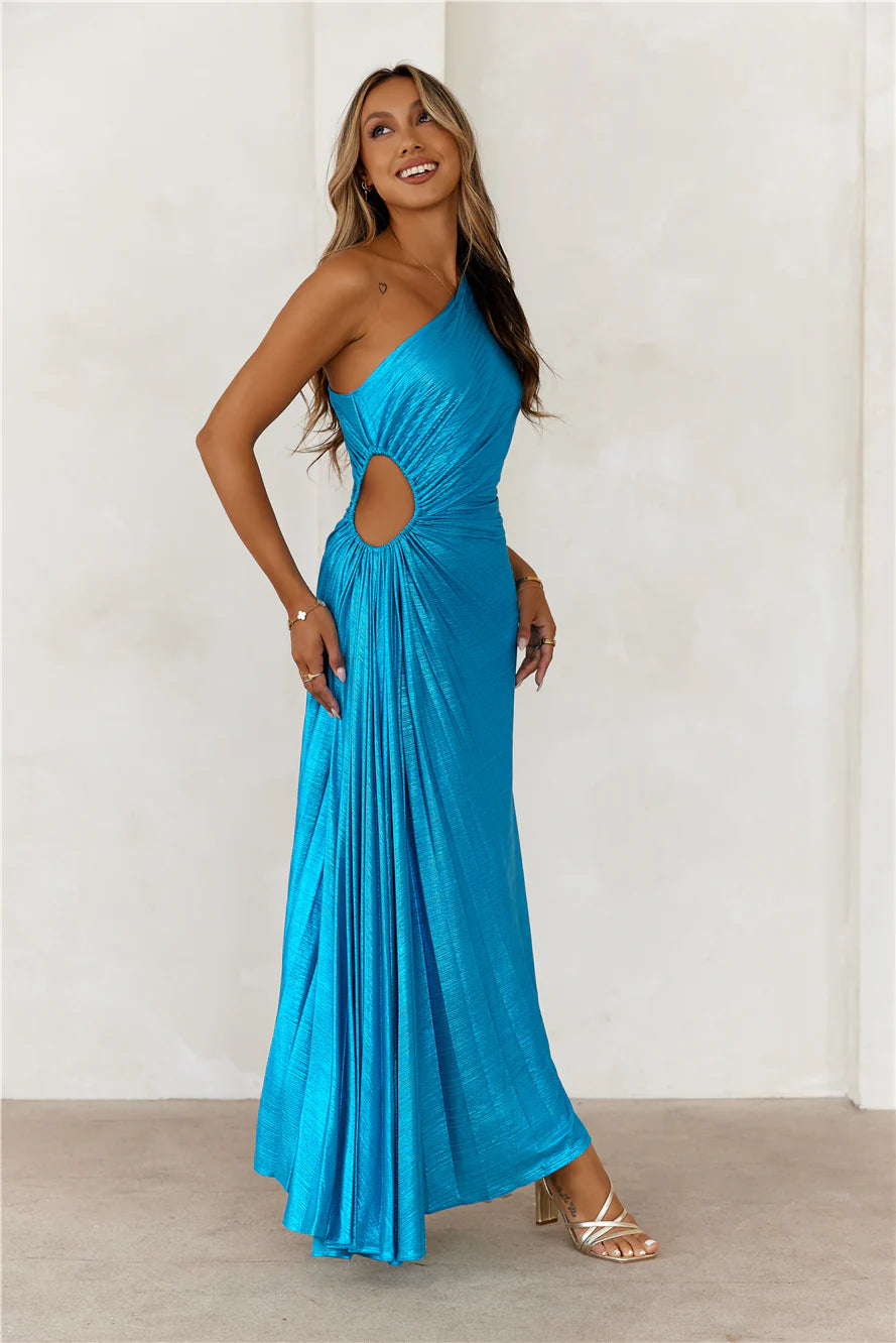 Love the look you're in with the Sapphire Soir��e One Shoulder Maxi Dress. Featuring a cut-out to the waist, a pleated design and a gorgeous metallic fabrication. Style with heels for all the likes.