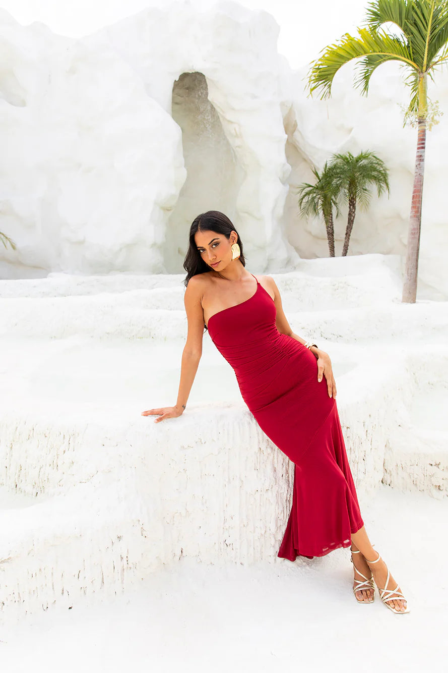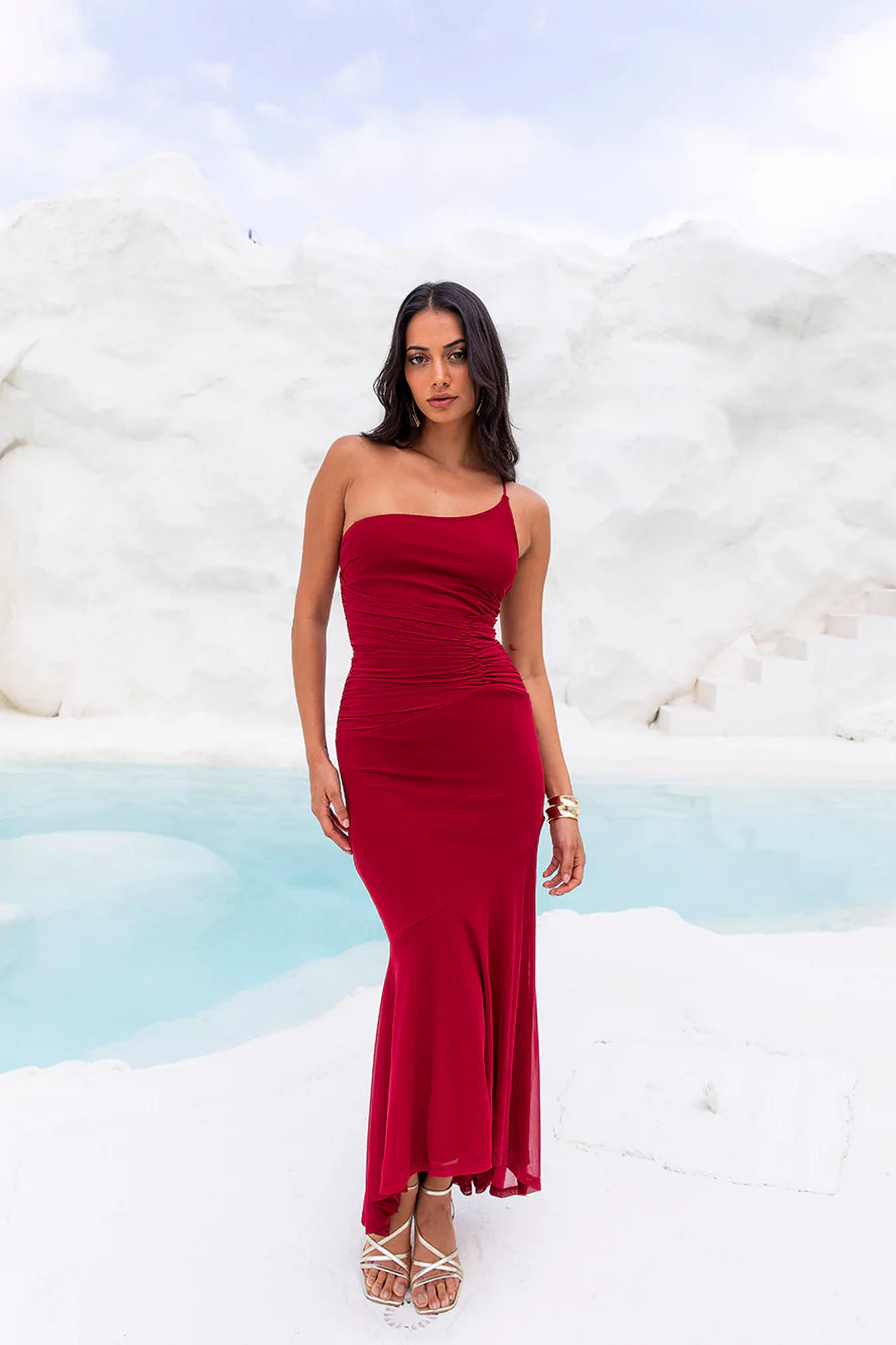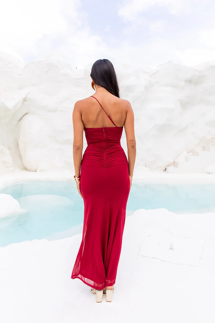 Channel your inner confidence and shine in the Self Expression One Shoulder Mesh Maxi Dress. Featuring a gathered bodice that'll elevate your look and a longer back hem for extra class. Style with heels for a fancy event.