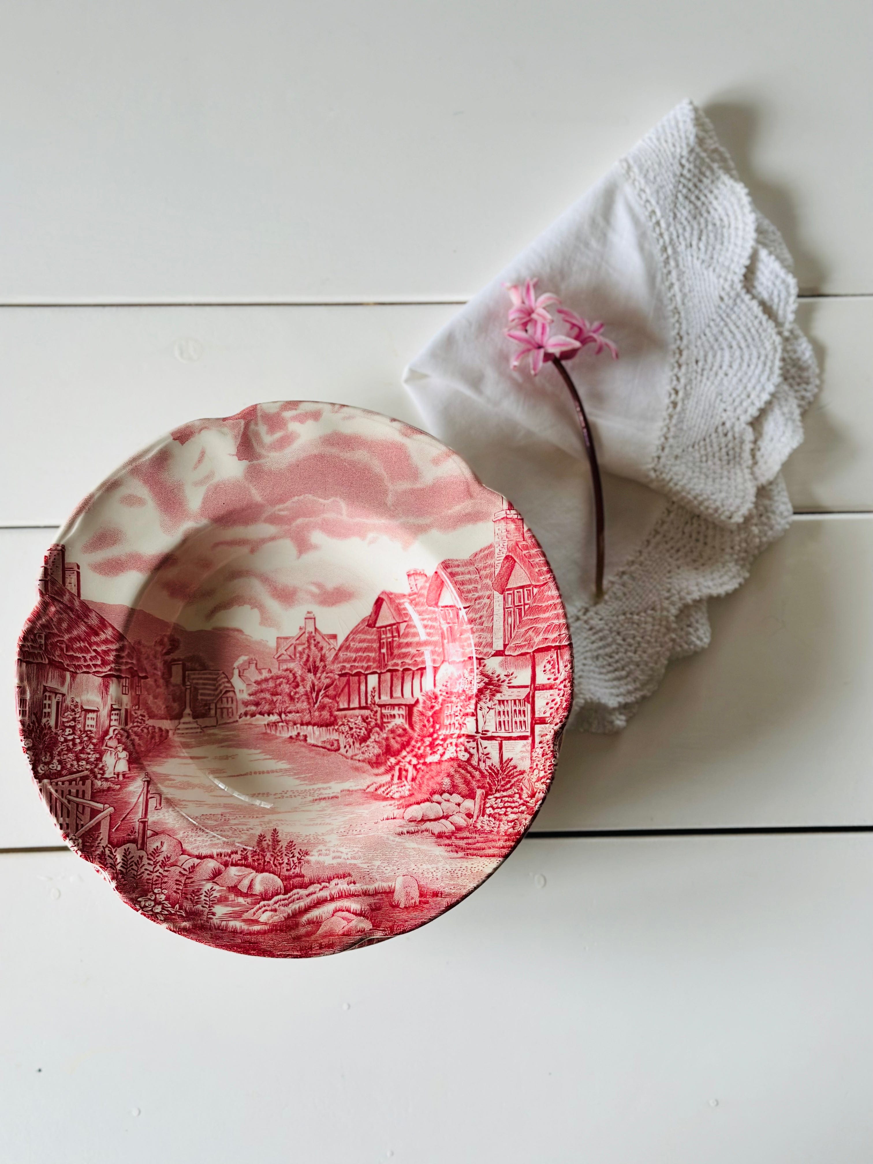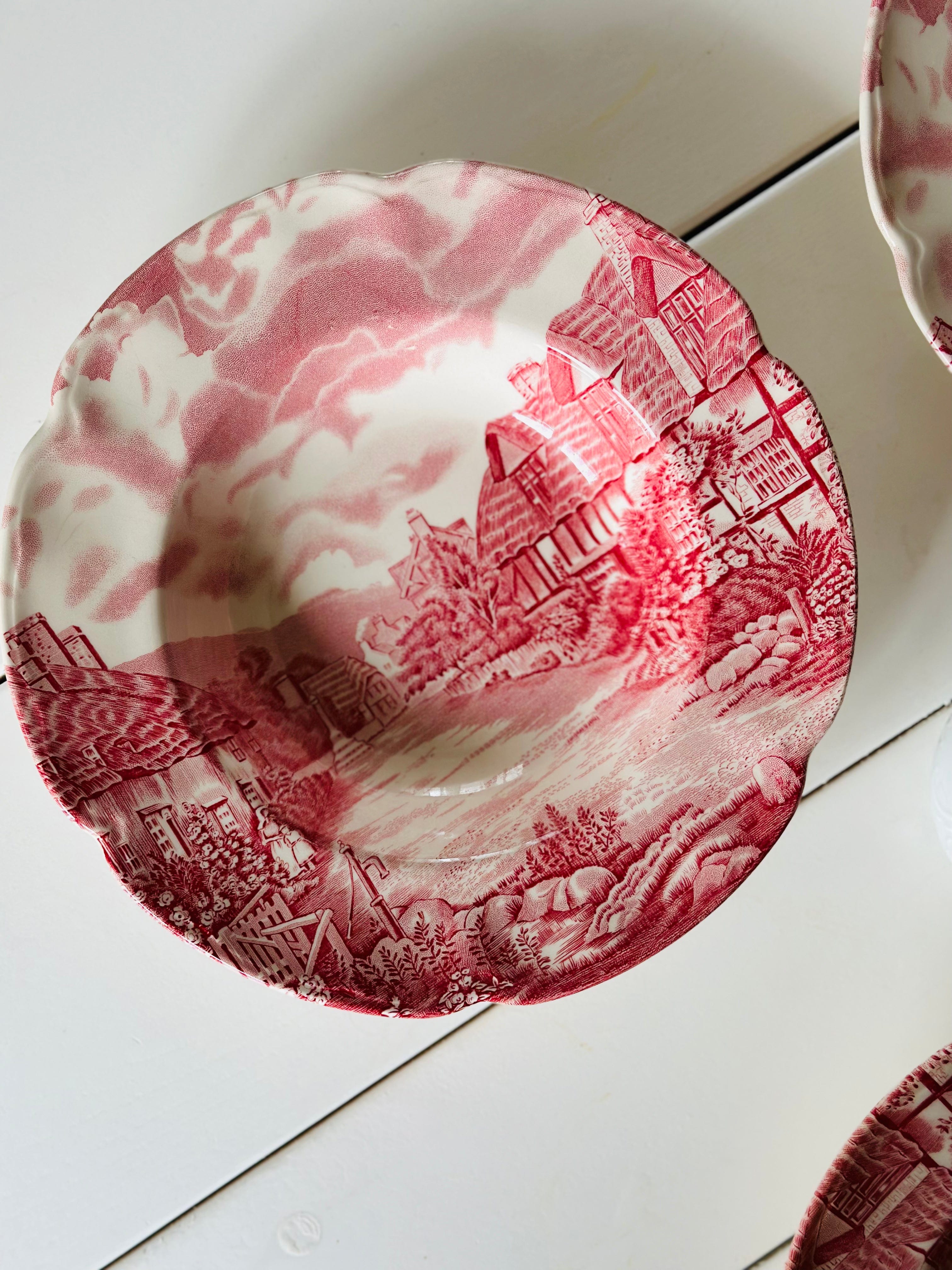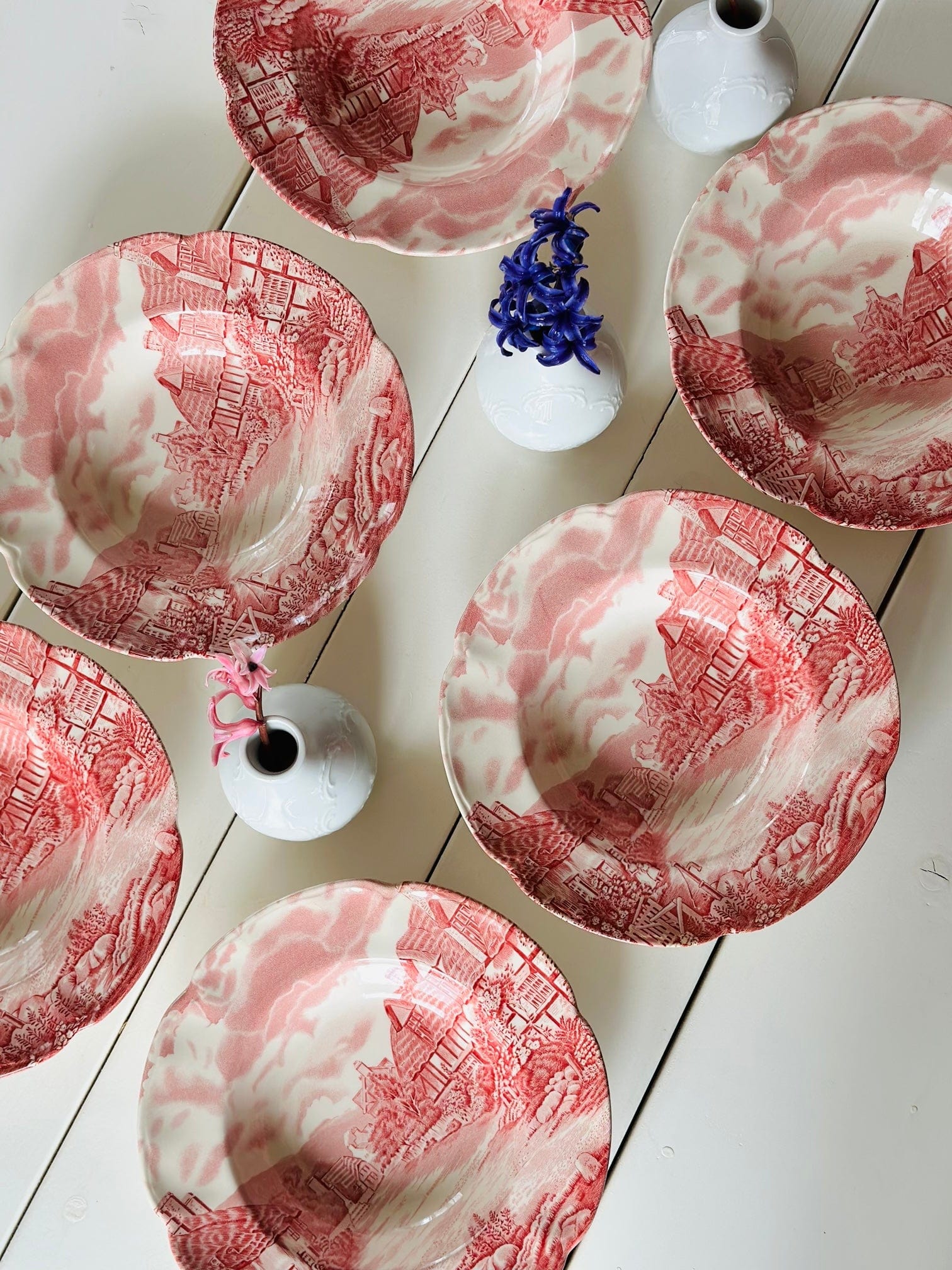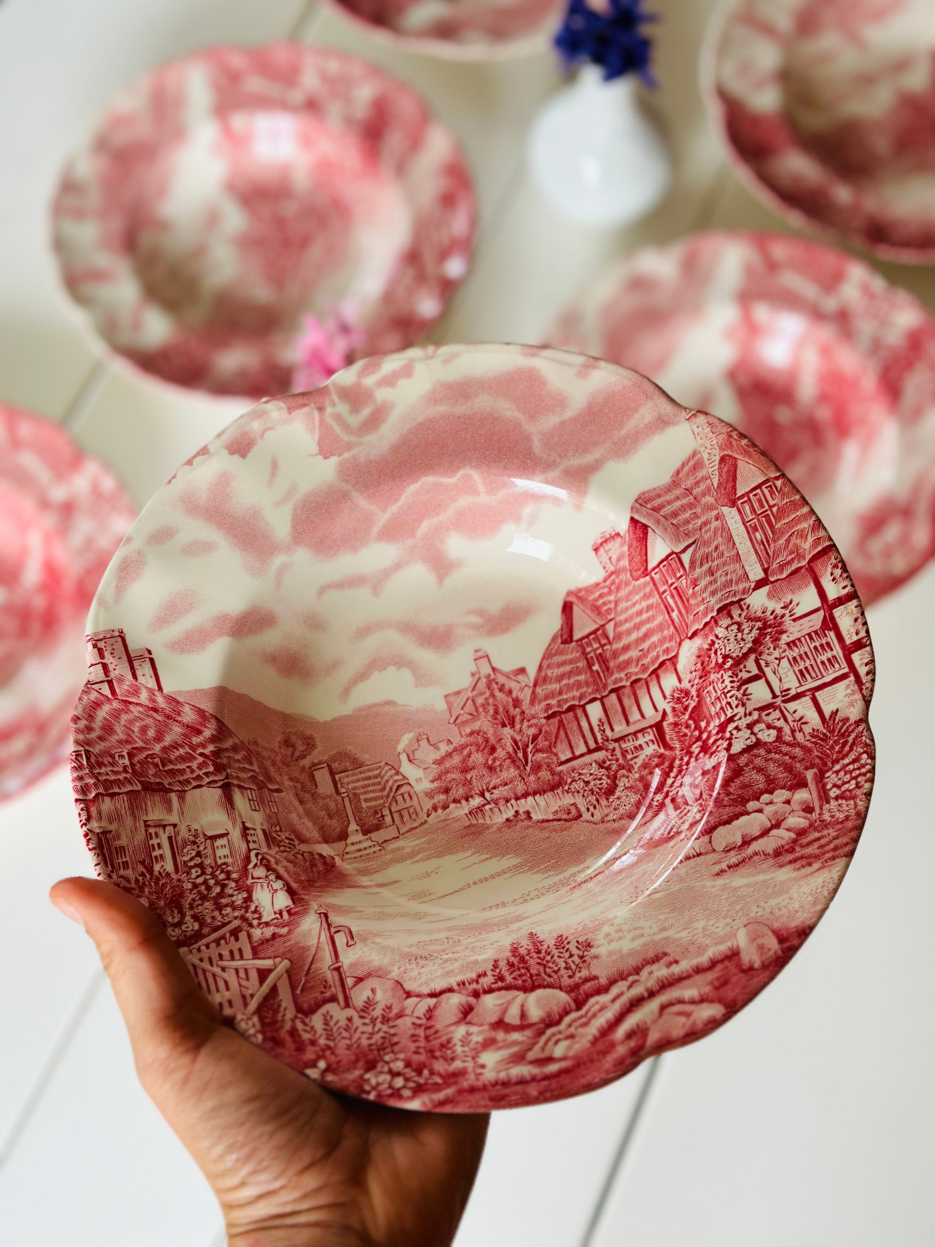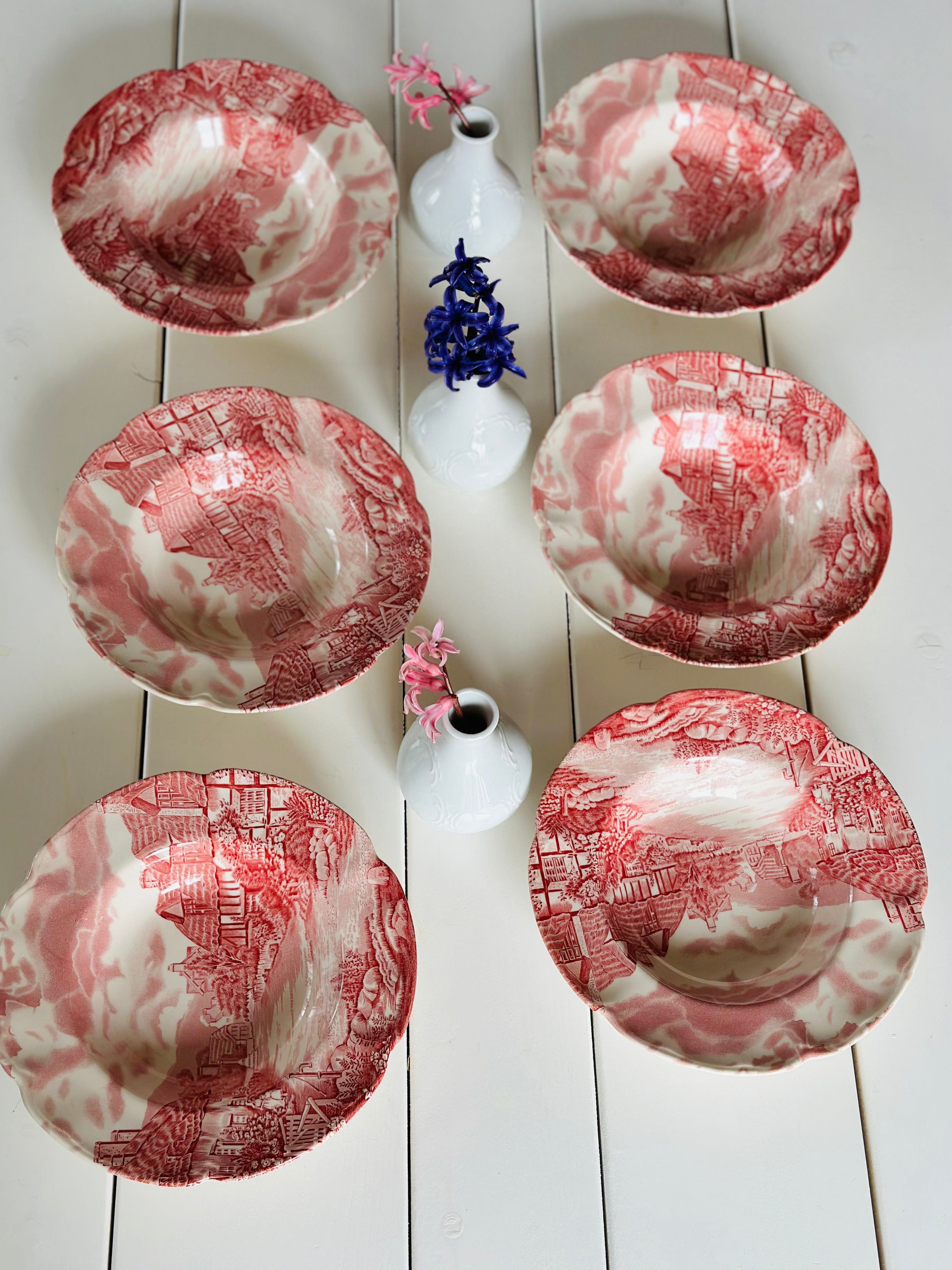 Set 6 farfurii adânci, porțelan englezesc alb cu roșu, marca Johnson Bros, colecția Old English Countryside