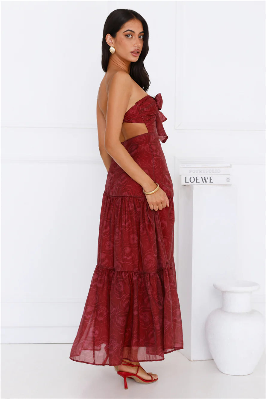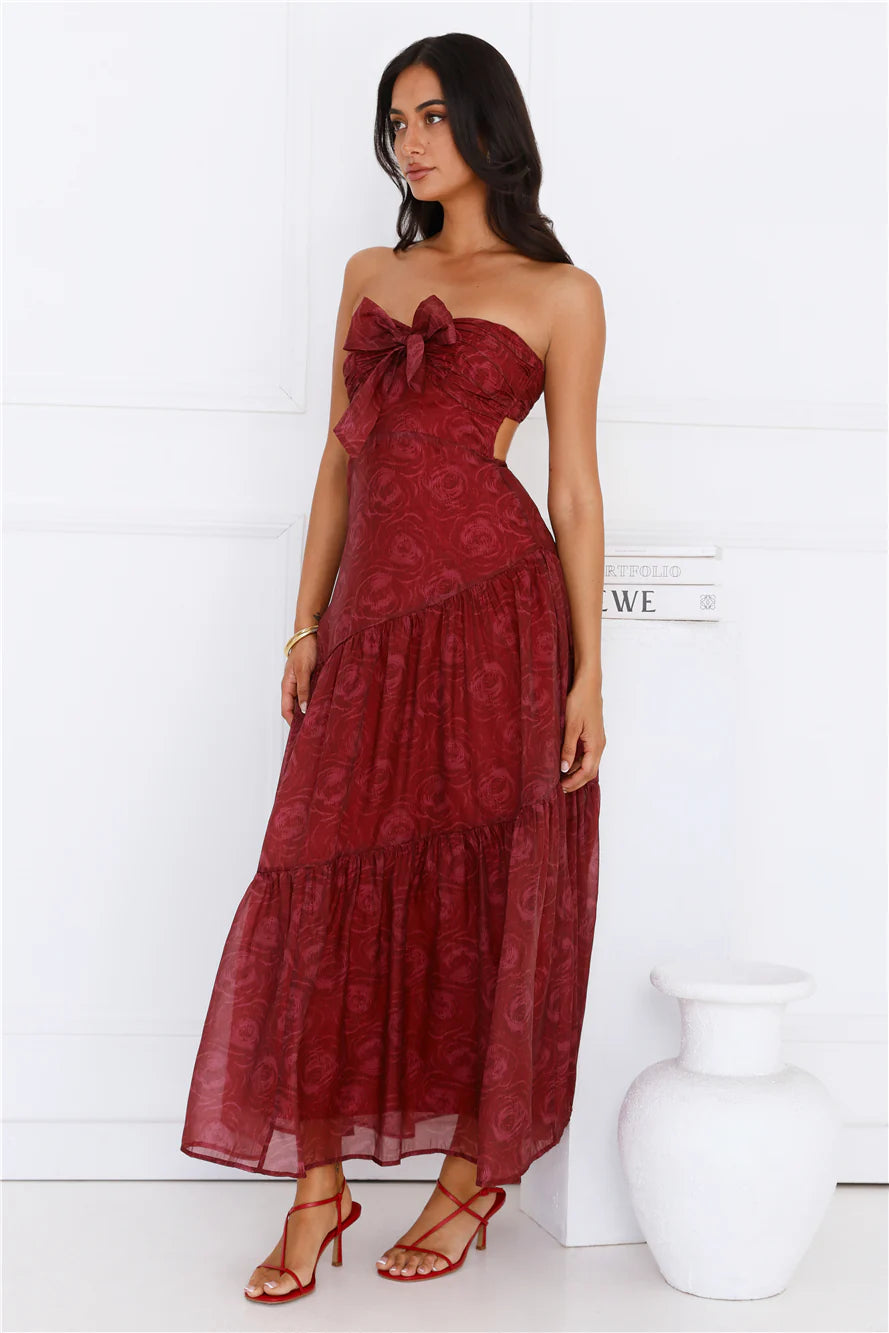 Be seen in a gorgeous dress. The Twilight Night Strapless Maxi Dress features a tie to the neckline, a flowy skirt and a dreamy print. Style with heels for a 'fit you'll want pics' in!