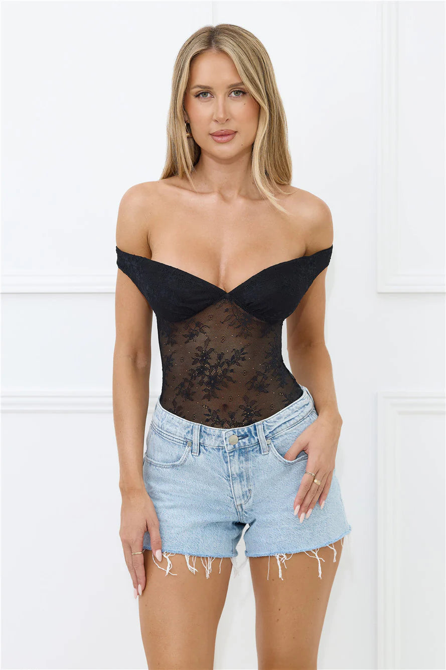 The Vibes Of The Night Lace Bodysuit is designed to captivate with its romantic lace and off-the-shoulder charm. The elastic back ensures a snug, flattering fit. Featuring convenient snap closures to the gusset, it��s perfect for pairing with anything from high-waisted pants to skirts.