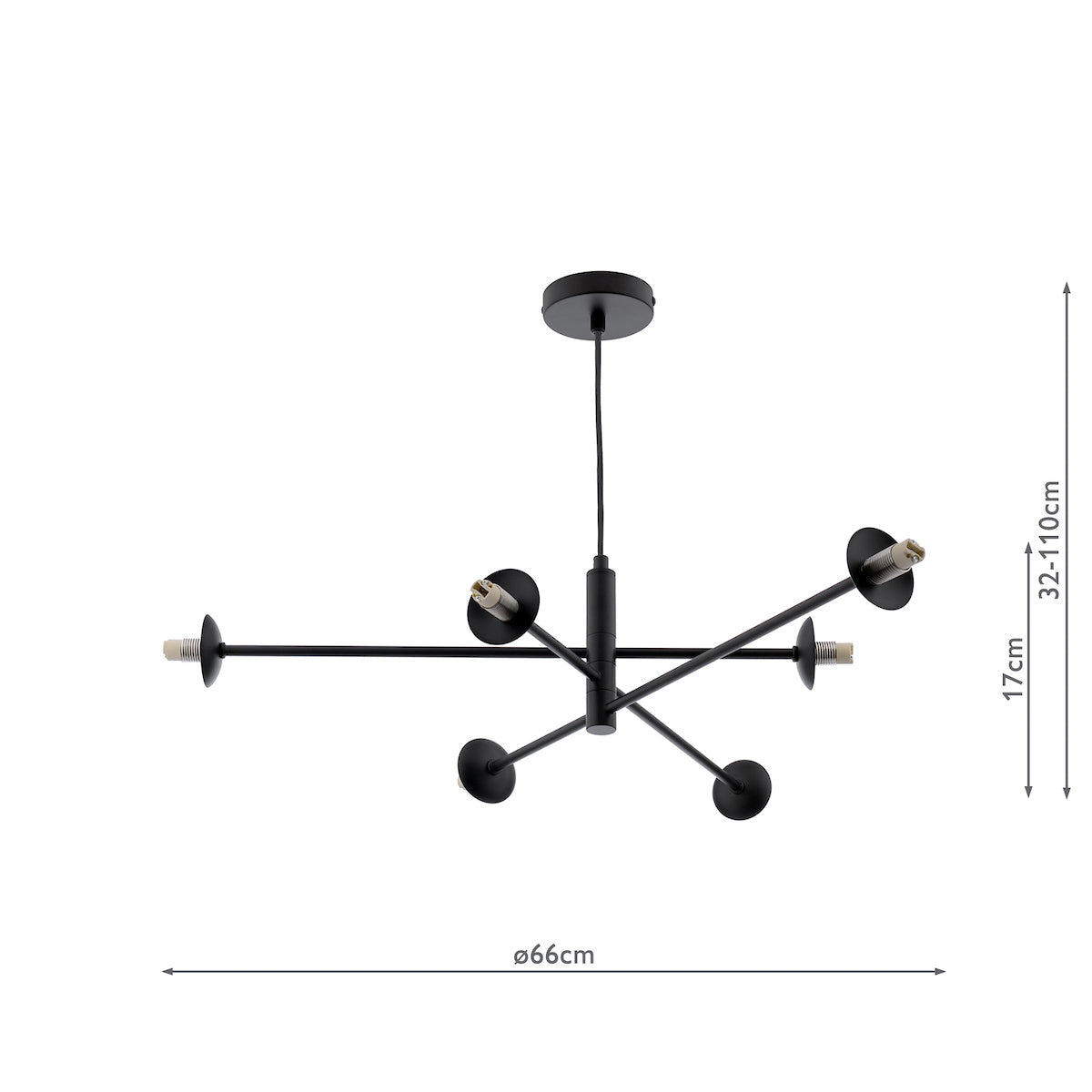 Vignette 6 Light Pendant Matt Black and Twisted Glass - The Vignette 6 Light Pendant Matt Black & Twiested Glass from dar lighting offers a stylish and contemporary lighting solution for your home. The Vignette features large clear twisted glass shades that add a touch of visual intrigue. The Vignette 6 light pendant features a black metal body with a matt black finish allowing the shades to really shine. The Vignette features a height adjustable black cable allowing you to set the perfect height. The Vignette 6 light pendant is perfectly suited as a stairwell light or makes a great statement light hung low over a dining room table With its expansive span and sleek profile, the Vignette pendant is designed to make an impact, even in rooms with low ceilings. The striking contrast between the matte black metal body and the twisted glass shades is a testament to its contemporary design sensibilities, offering both simplicity and sophistication. For added customization, the pendant features adjustable height during installation, allowing you to tailor its positioning to your preference and the room's requirements. Seamlessly blending with a variety of decor styles, the Vignette 6 Light Pendant boasts a black cable that complements its overall aesthetics. Whether illuminating a dining area, living room, or any other space, this pendant light is a versatile choice that exudes both style and functionality. The Vignette 6 Light Pendant accommodates 6 G9 bulbs (bulbs not supplied), offering ample brightness. For optimal energy efficiency and a touch of vintage charm, we recommend using LED filament lamps from our range of LED bulbs. Elevate your interior with the enchanting interplay of light and design through the Vignette 6 Light Pendant Matt Black & Twisted Glass, a harmonious fusion of modern aesthetics and practical lighting solutions. SPECIFICATIONS: H MIN: 320MM H MAX: 1100MM W/DIA: 1250MM MAX WATT: 6 X 6W G9 LED (BULB NOT INC.) CLASS: I - IP RATING: IP20 FINISH: Matt Black, Glass MATERIAL: Glass, Metal.
