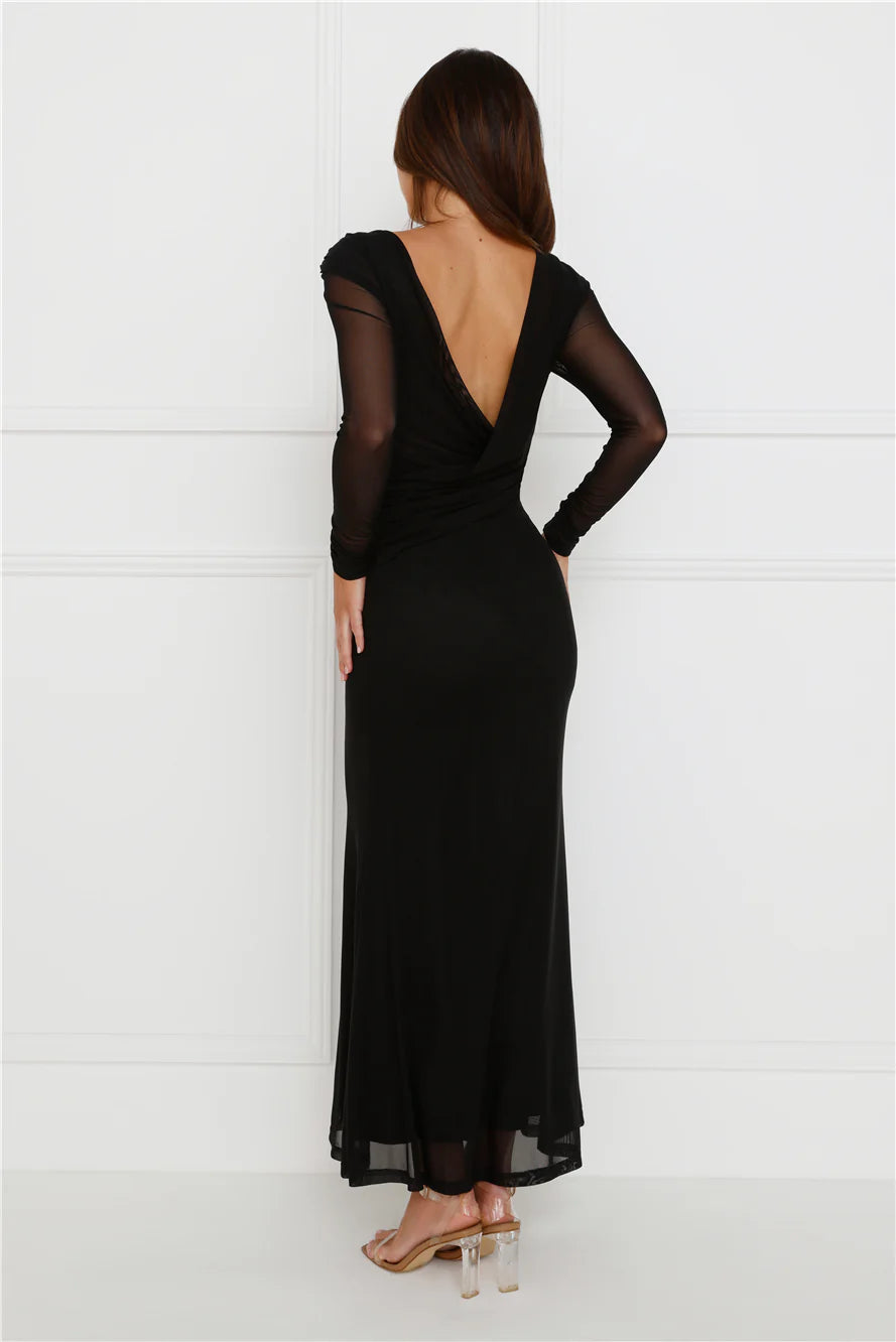 Enter the party in a sophisticated style. The Whimsy Wonder Long Sleeve Mesh Maxi Dress features an open back design, long sleeves, and a flowy hem. Style with heels for all the likes on your 'fit.