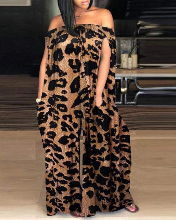 Style: Casual,Chic Type: Jumpsuit Material: Polyester Neckline: Off Shoulder Sleeve Style: Sleeveless Length: Long Pattern Type: Leopard